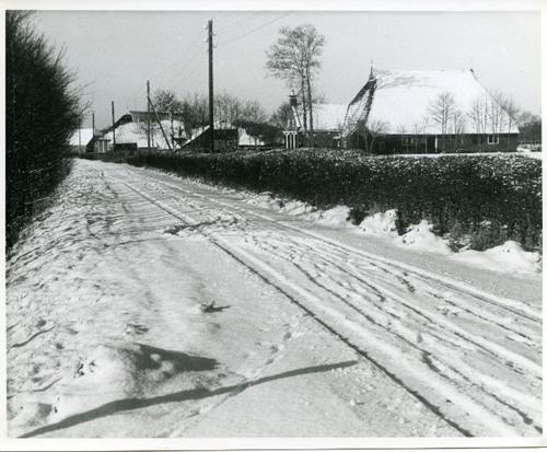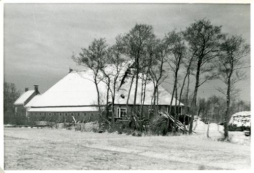 Ffoto in zwart-wit van een boerderij verscholen tuss...