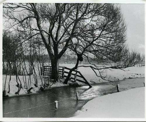 Foto in zwart-wit van besneeuwde landerijen door J.D...