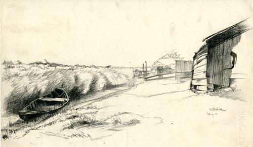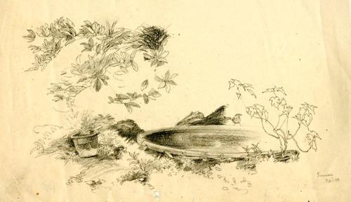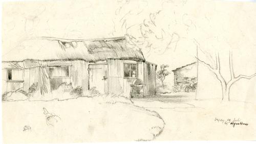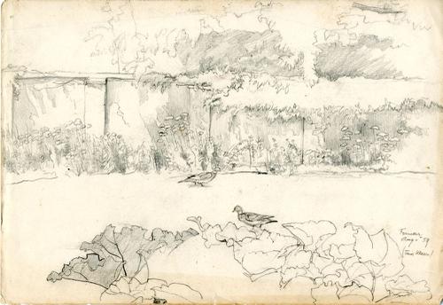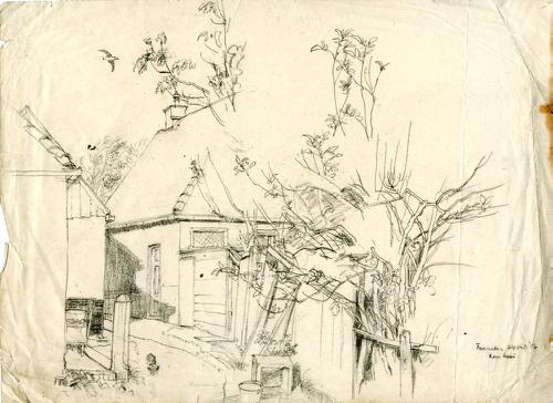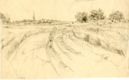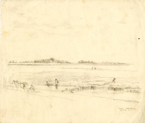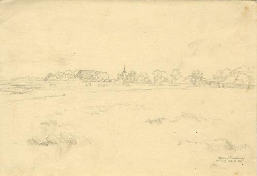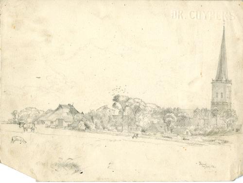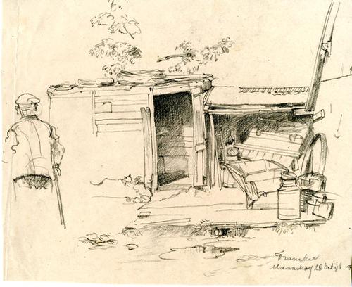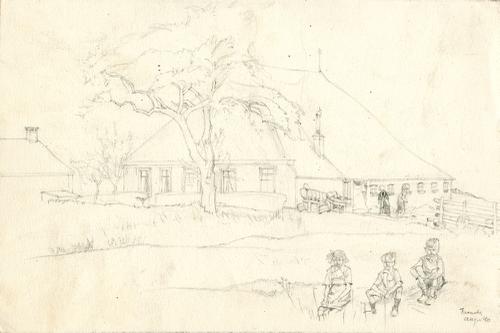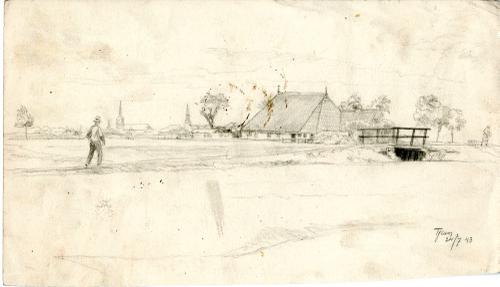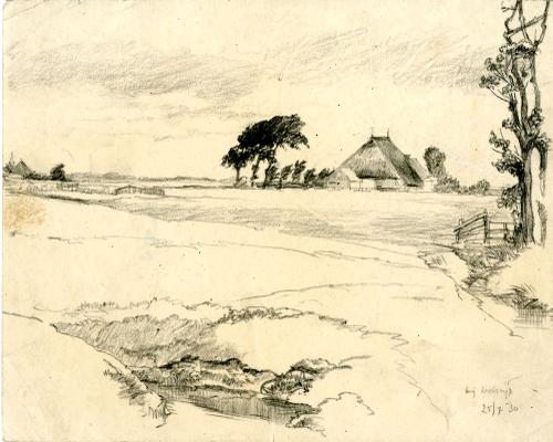 Tekening met potlood van een erf bij Arum door Sjoer...