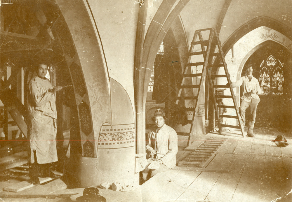 Foto van drie kerkschilders aan het werk in een kerk...