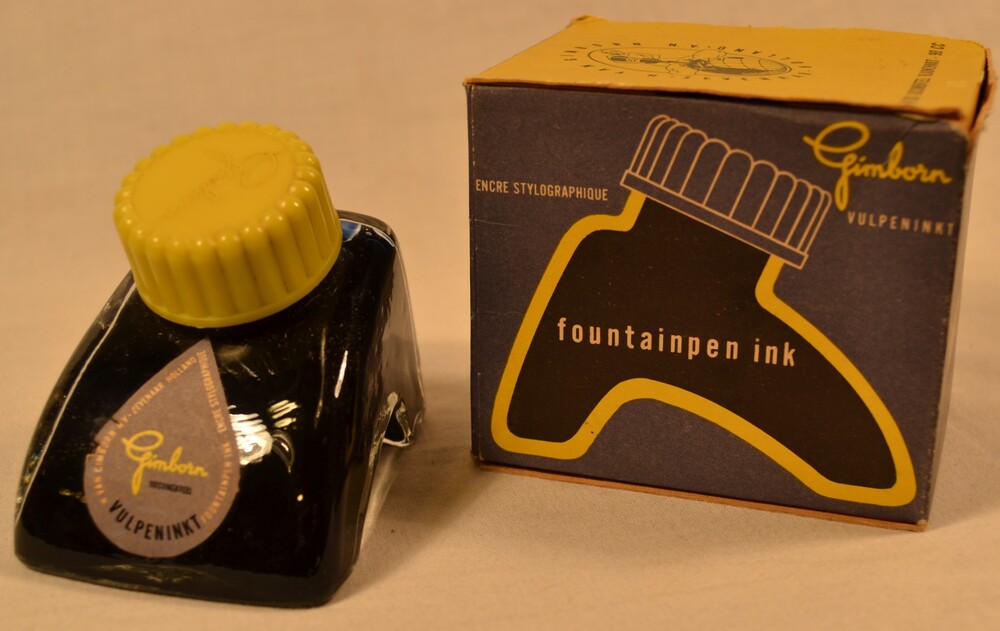 Flesje van glas gevuld met vulpeninkt in verpakkings...