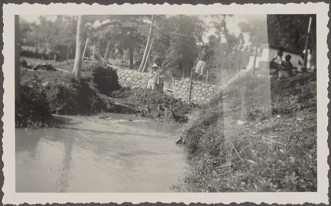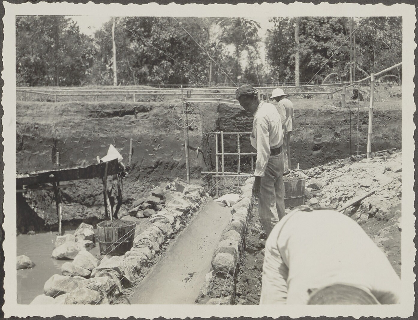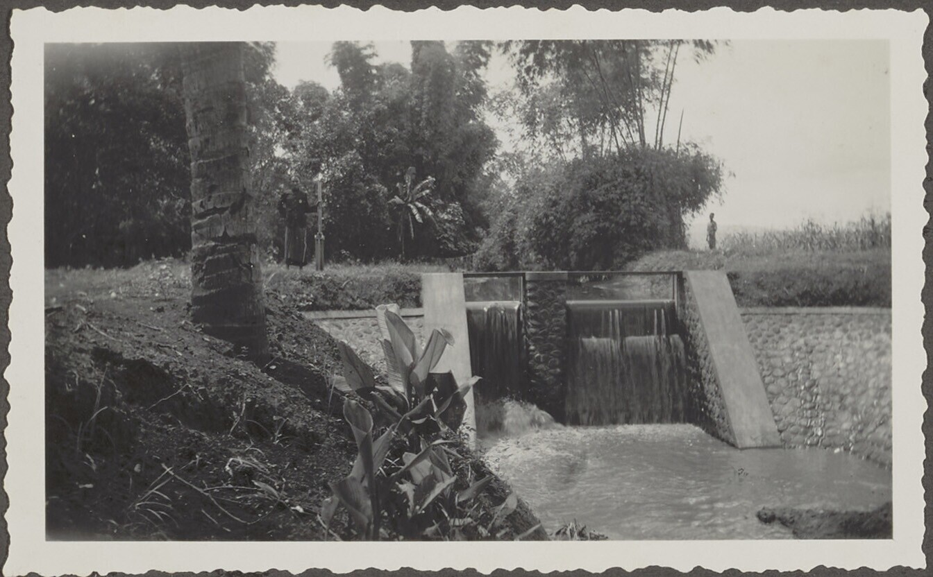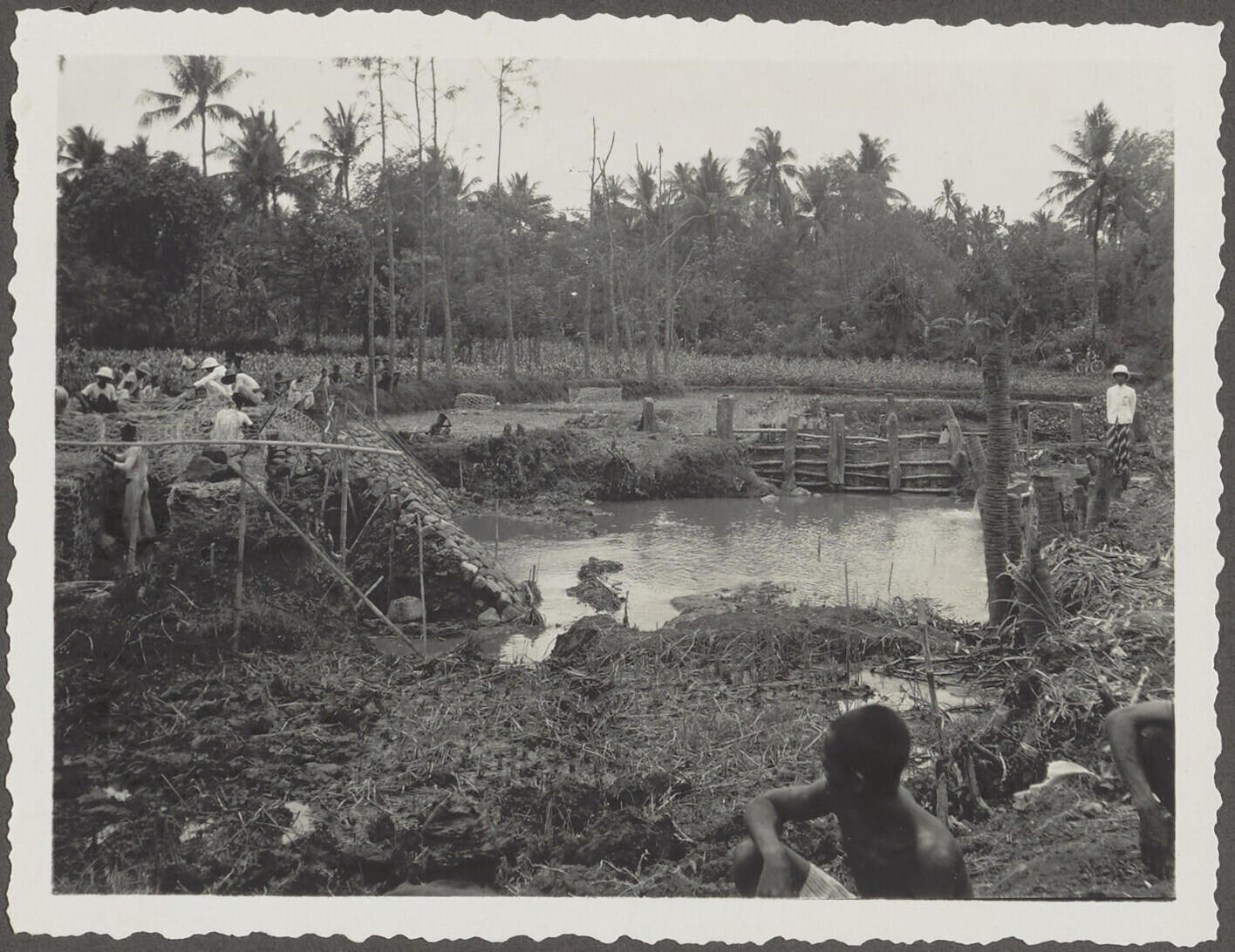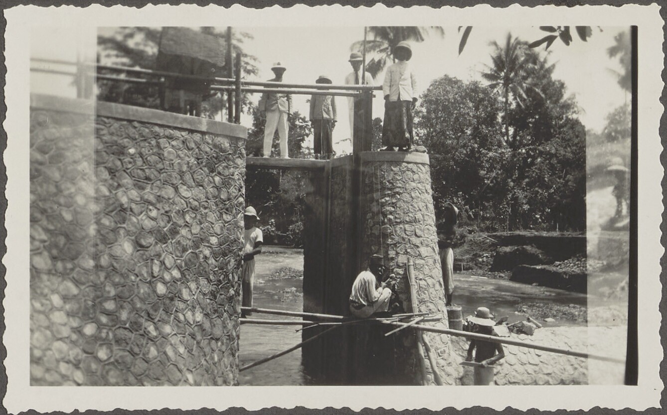 Twee Javaanse arbeiders werken aan een waterbouwkund...
