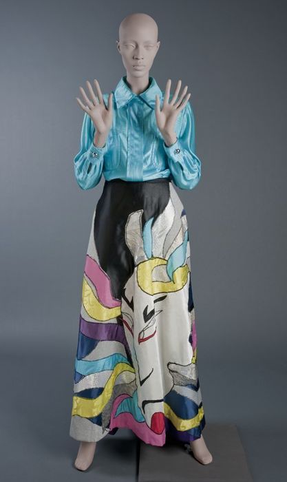 Voetlange wijde rok (2) waarop applicatie van boos t...
