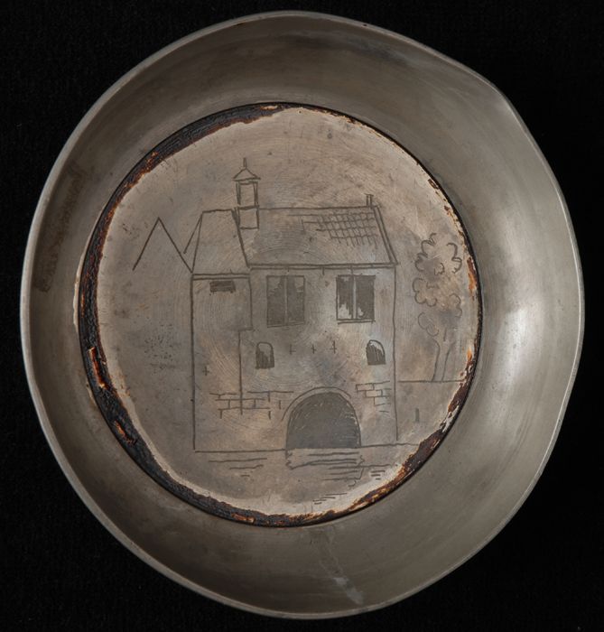 Rond bordje met opstaande rand, op bodem ingekraste ...