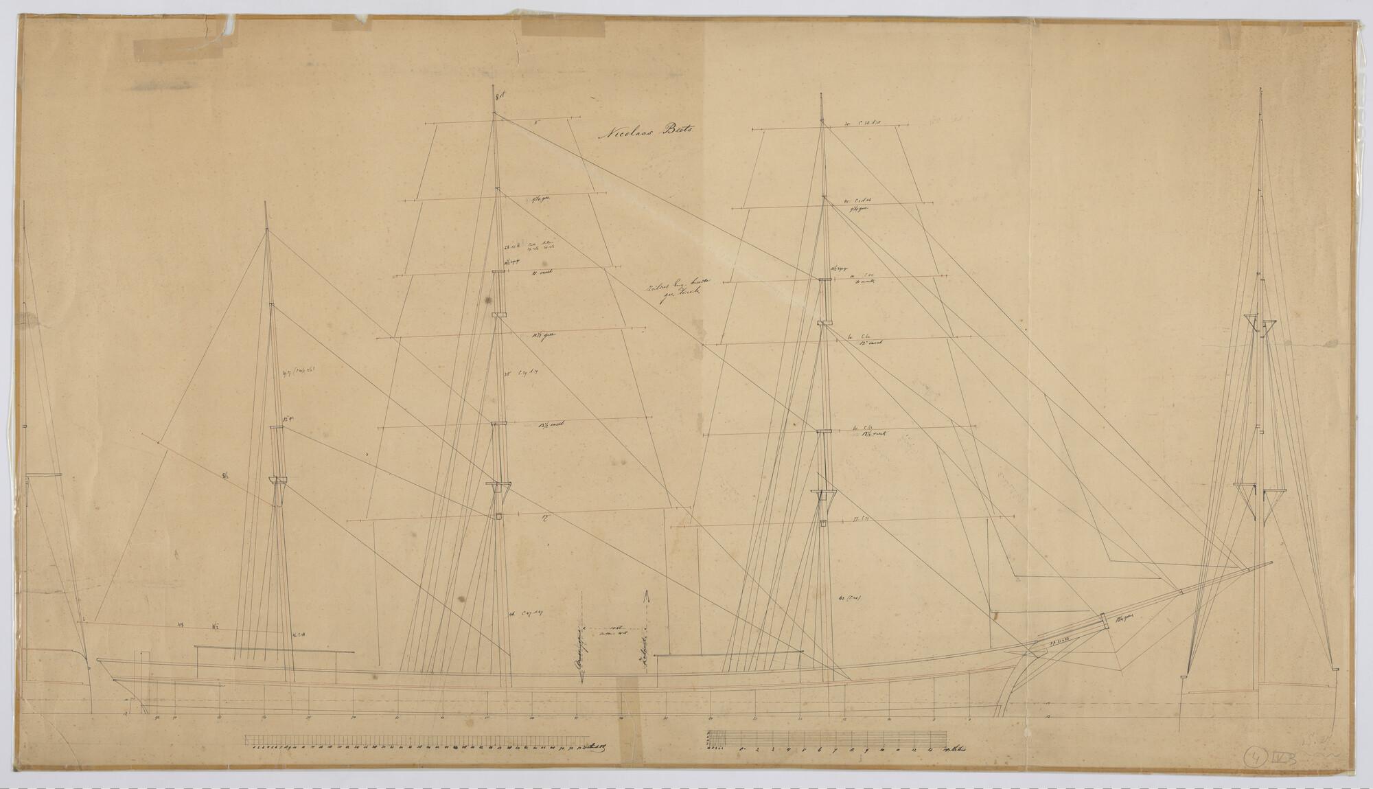 Zijaanzicht met zeilplan van het barkschip 'Nicolaas...