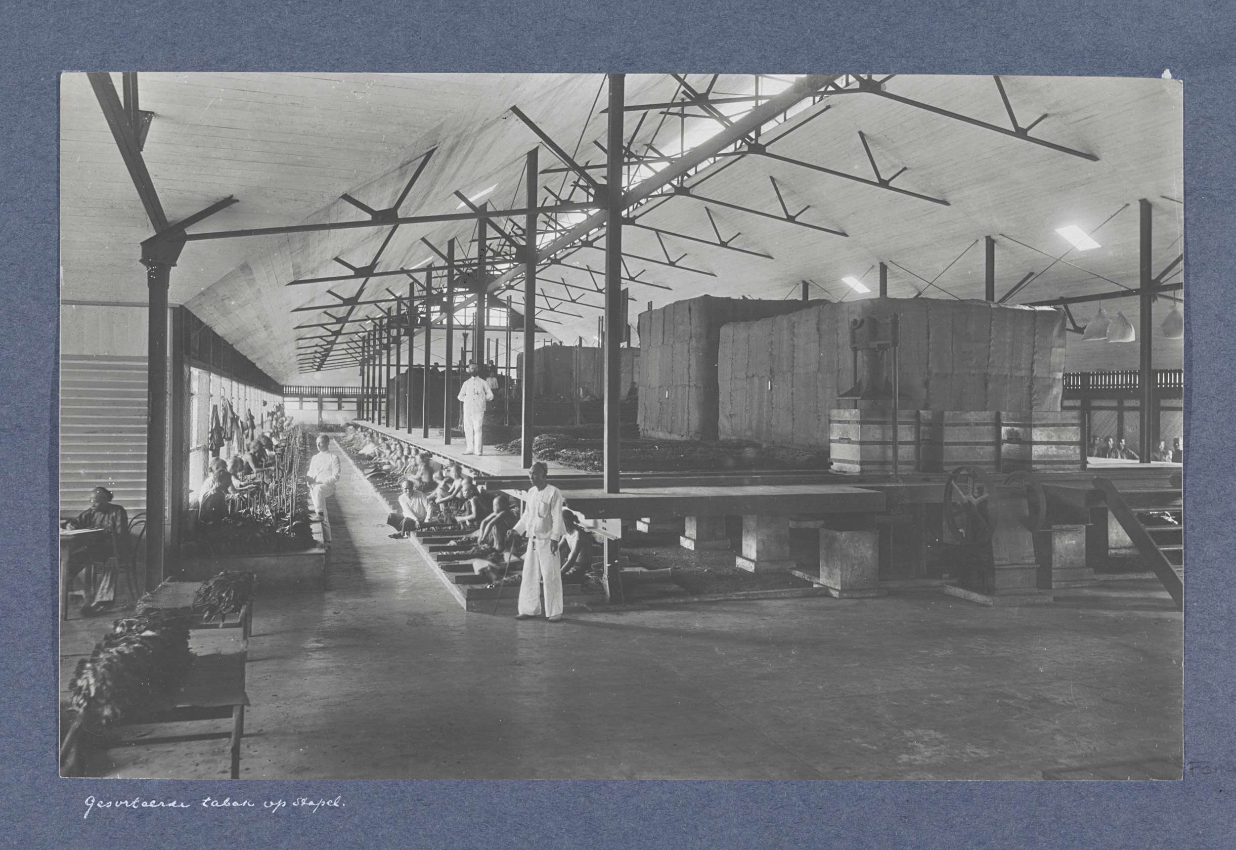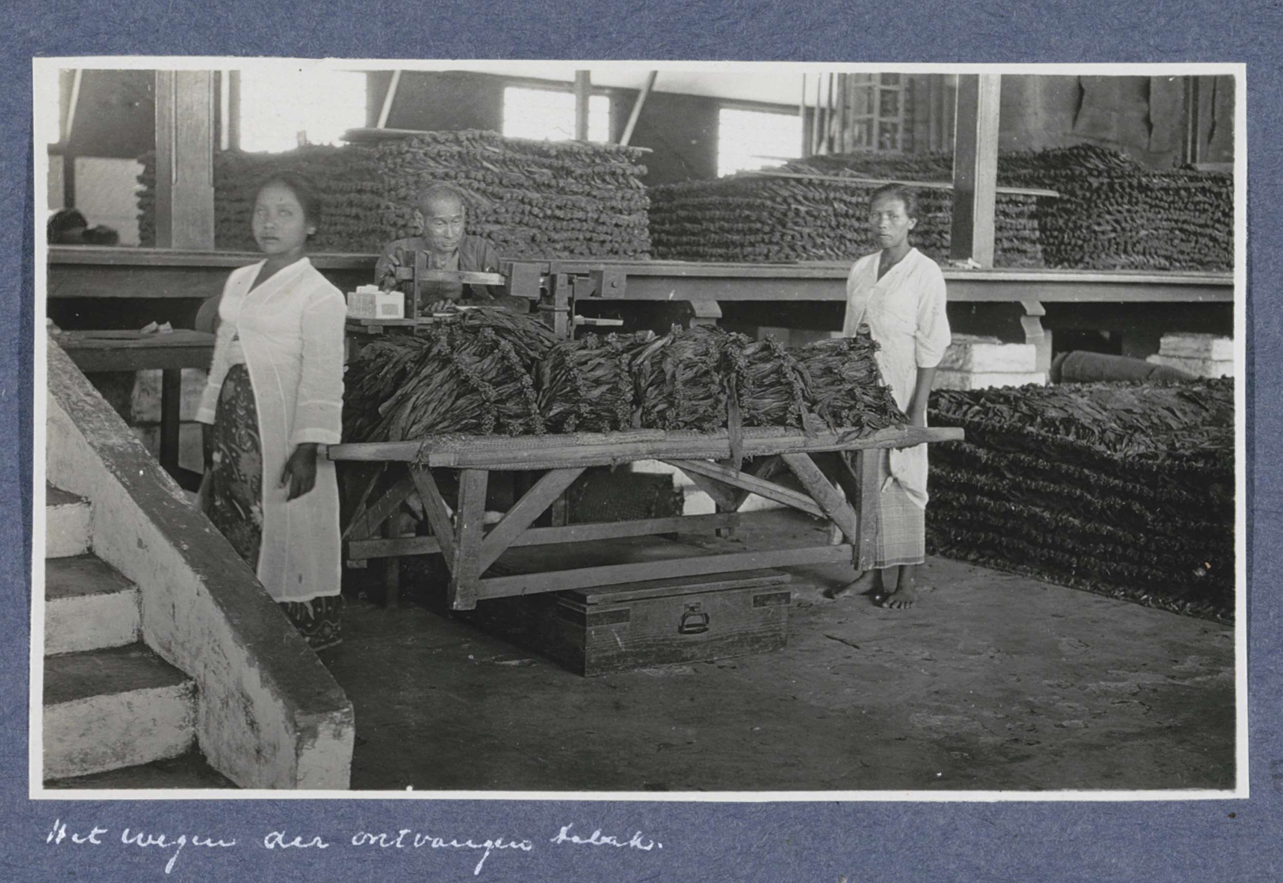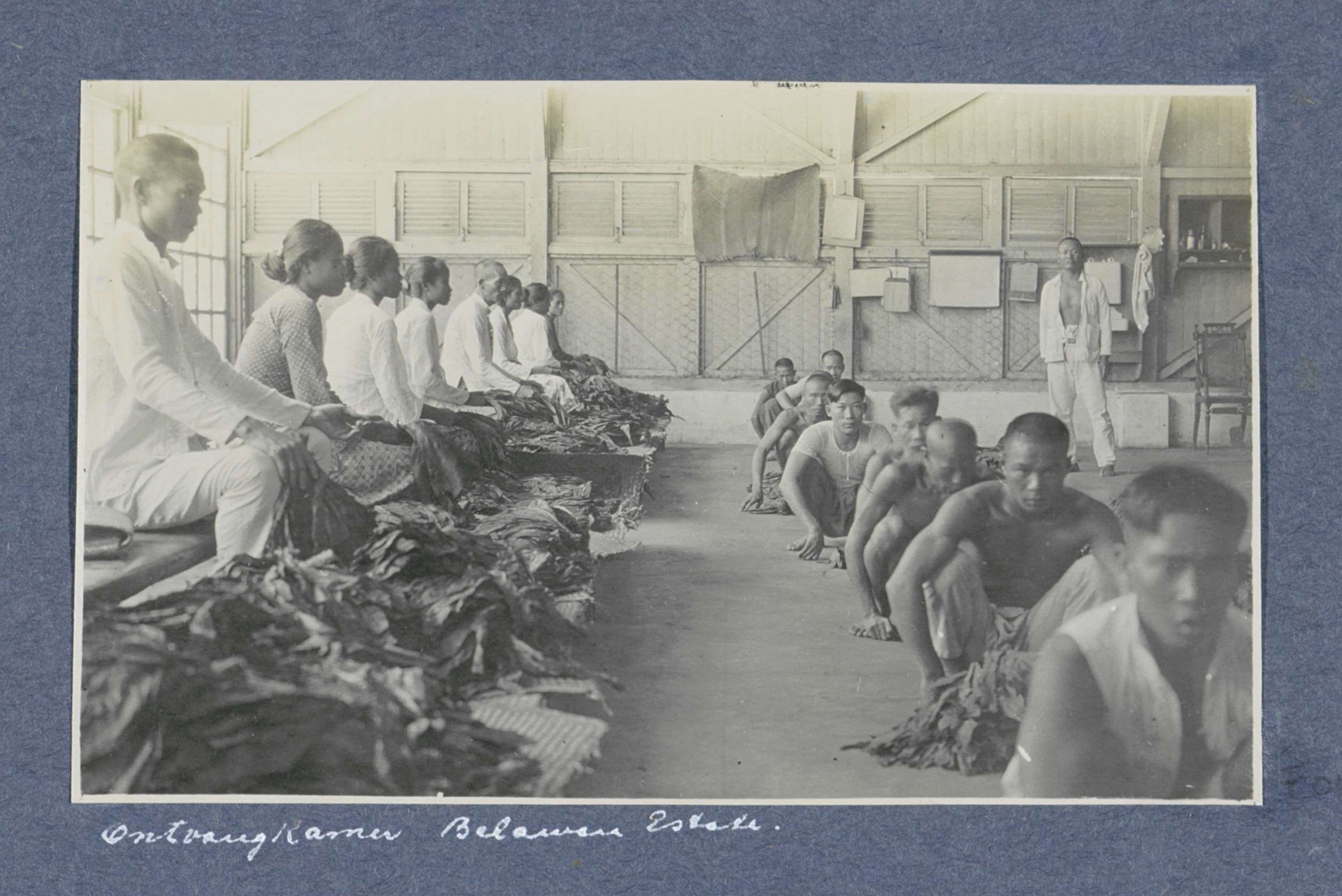 Arbeiders met tabaksbladeren in de ontvangkamer van ...