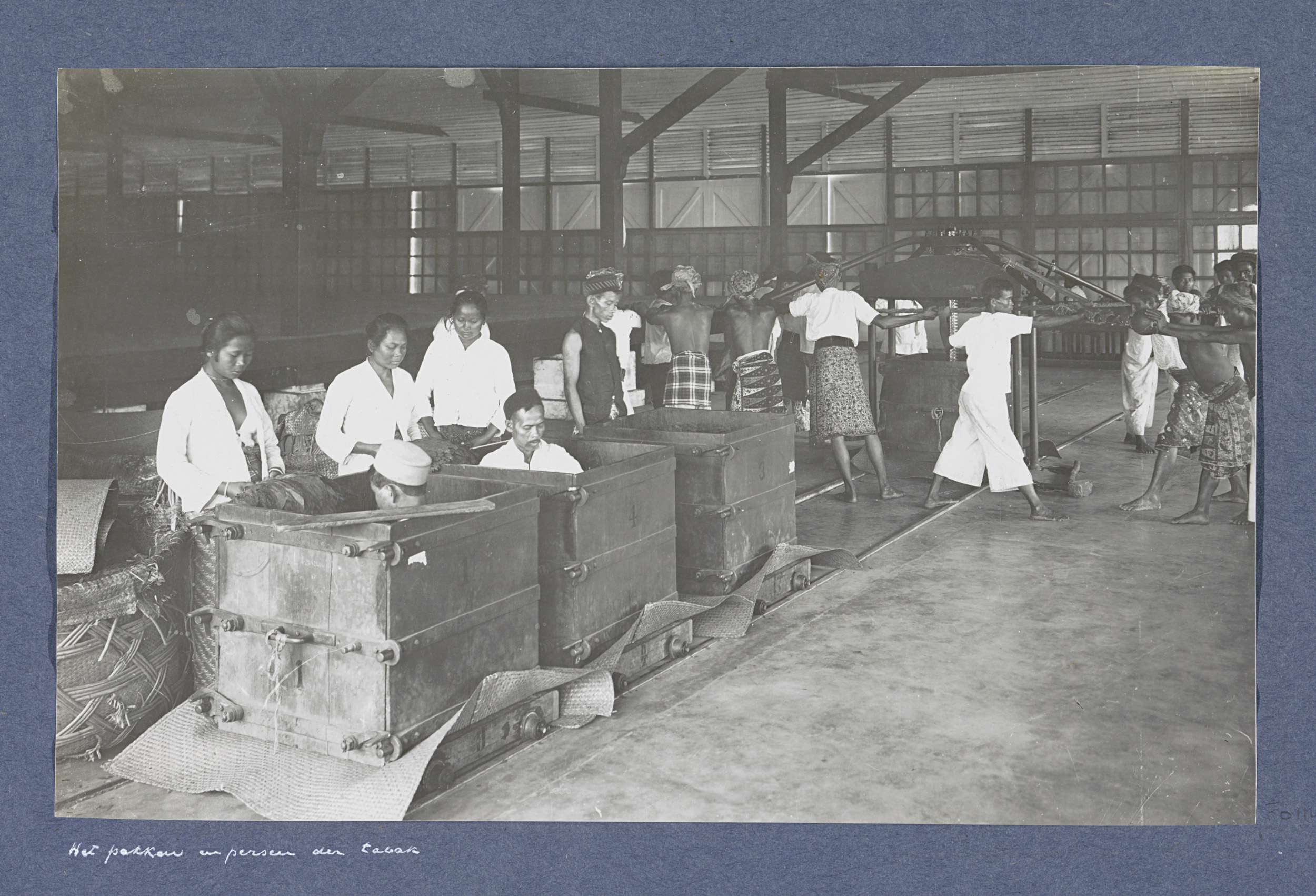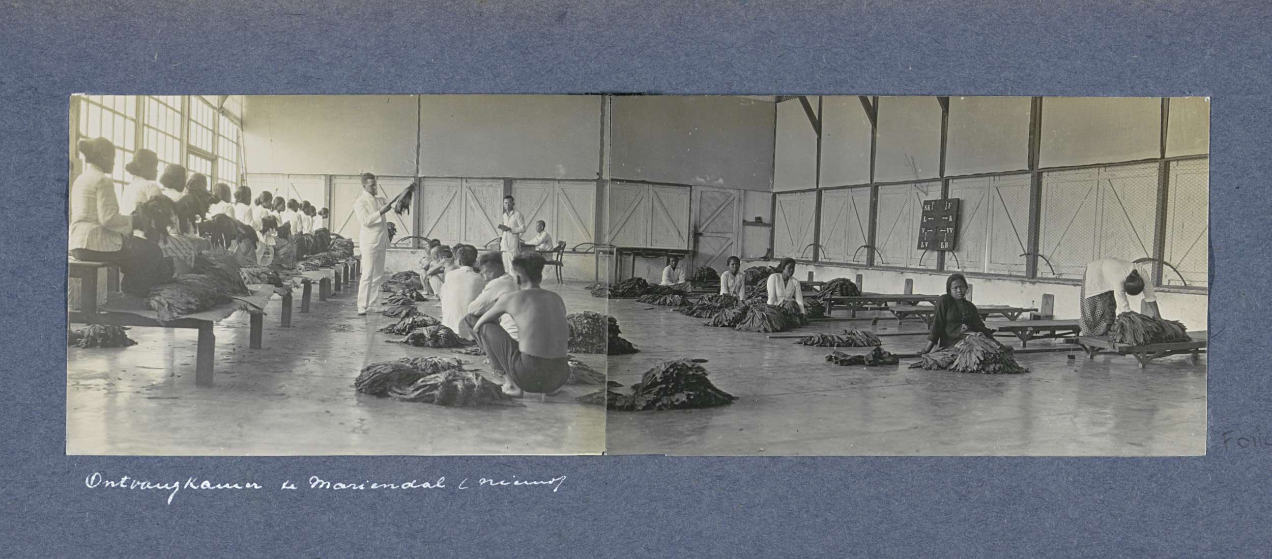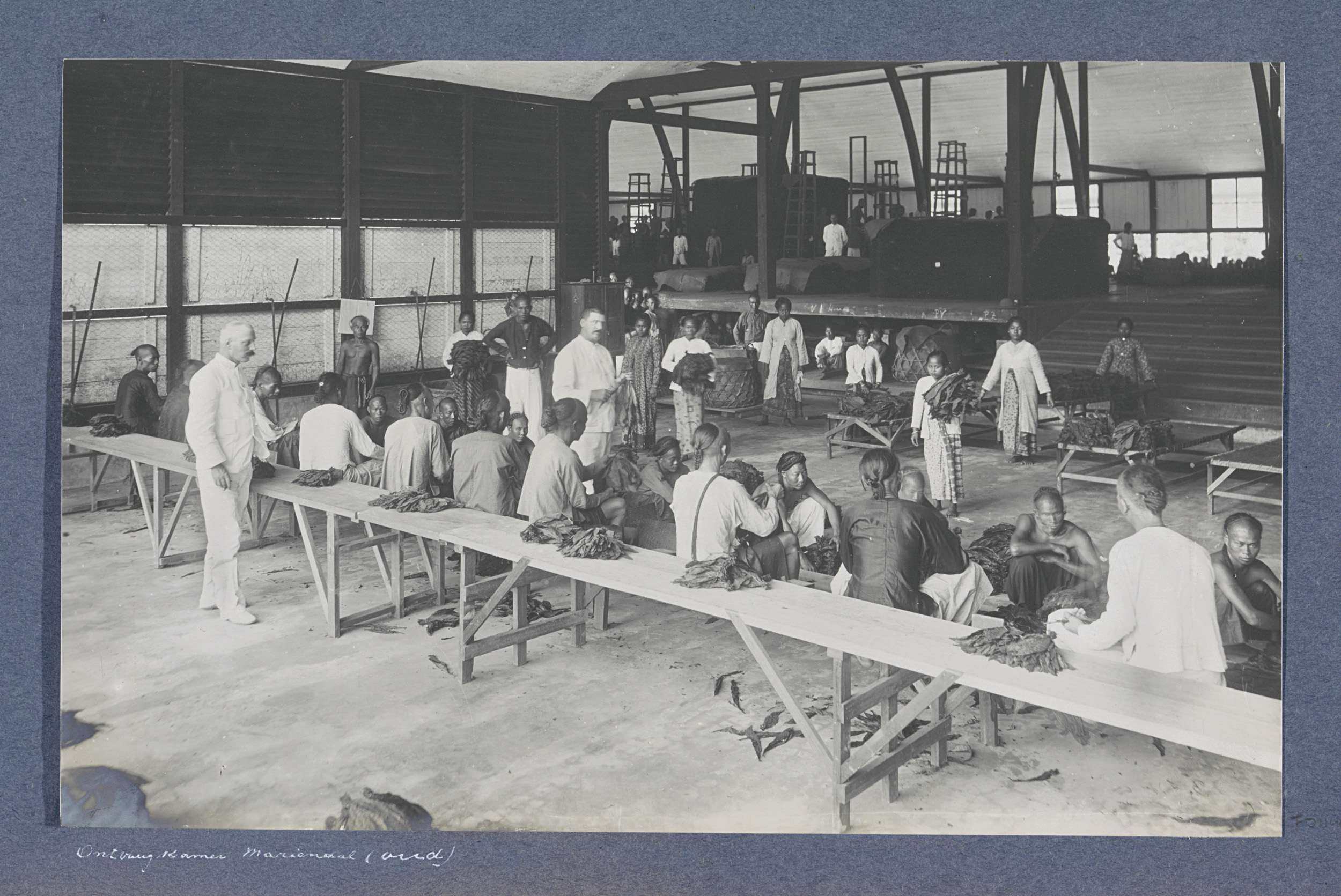 Arbeiders met tabaksbladeren in de ontvangkamer van ...