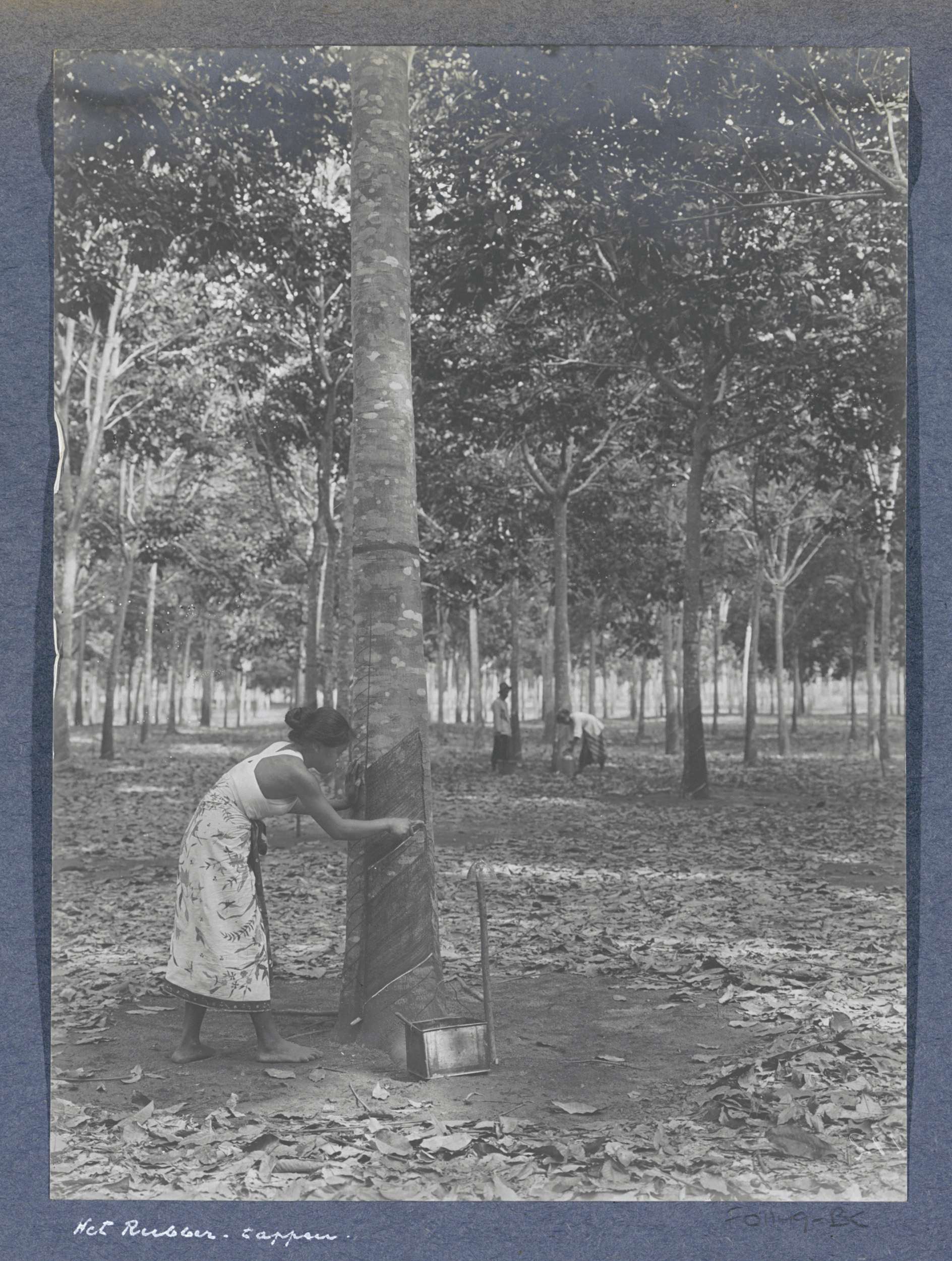 Vrouwen tappen rubber op een plantage op Sumatra