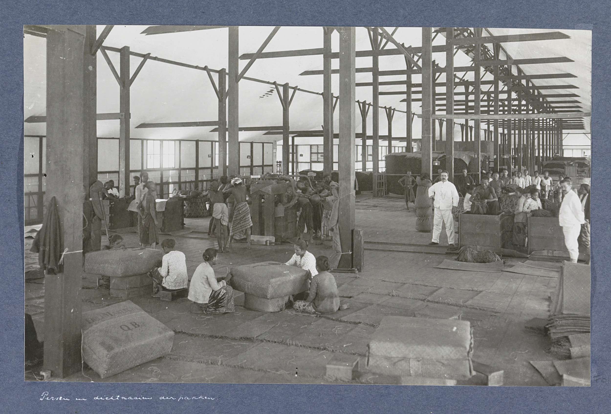 Mannen en vrouwen bezig met persen en dichtnaaien va...