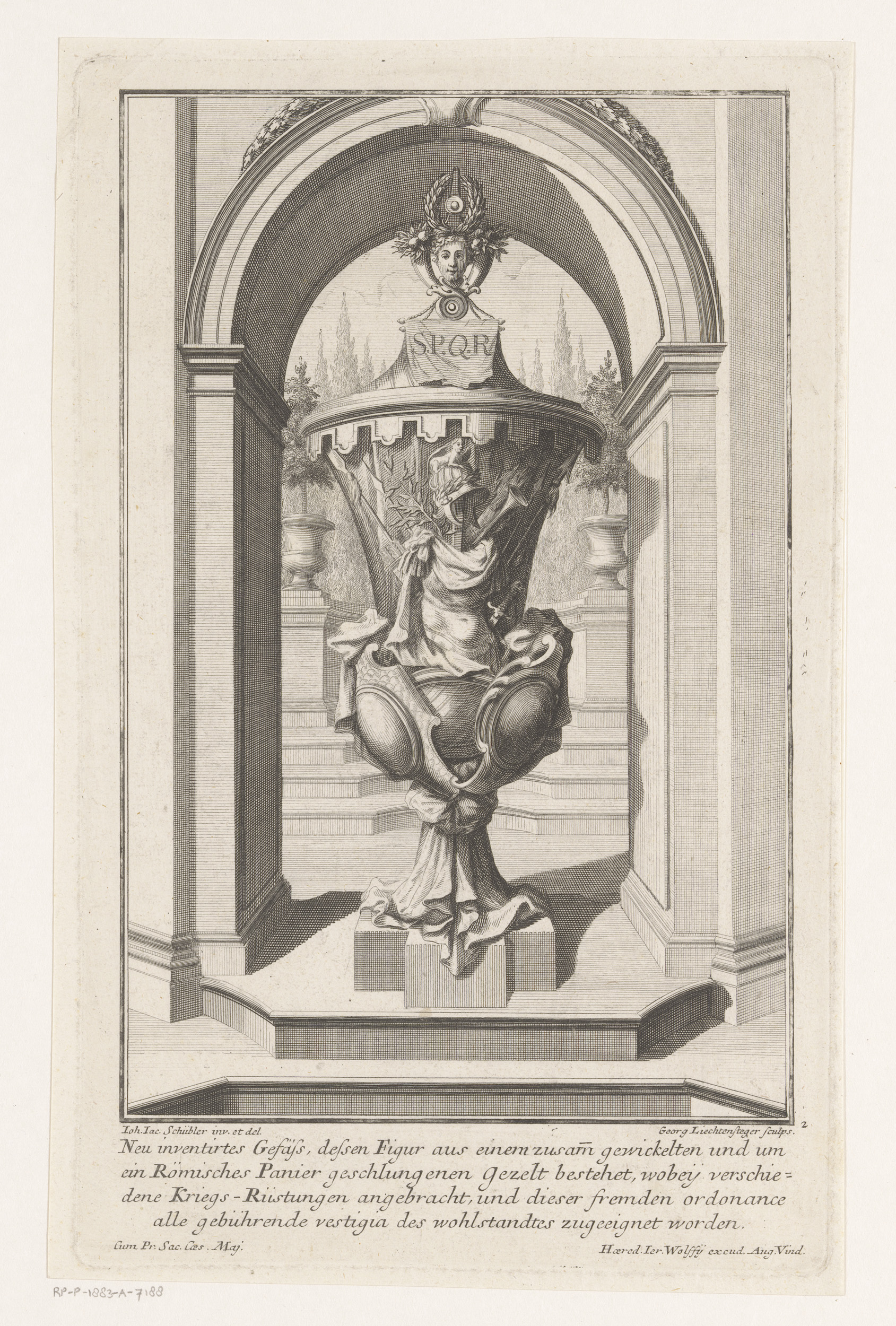 Tuinvaas met wapentrofee en de afkorting van de teks...