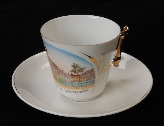 Witte kop en schotel met goudkleurig oor en meerkleu...