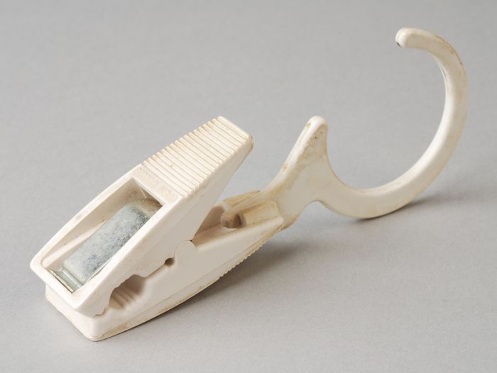 Witte haak en knijper voor het ophangen van theedoeken