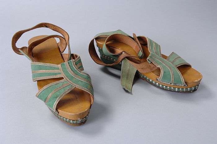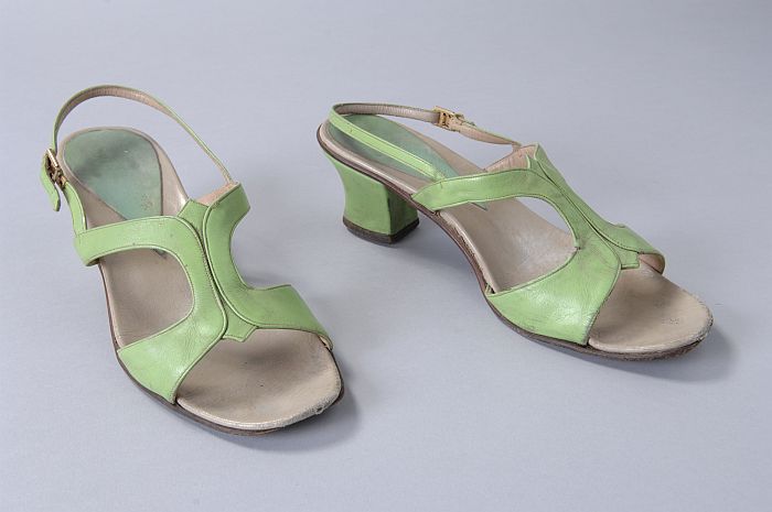 Grasgroene leren sandalettes met open teen, opengewe...