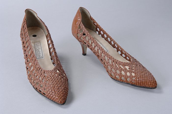Bruine van strookjes imitatie-leer gevlochten pumps ...