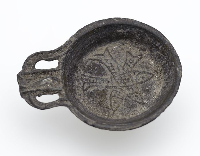Speelgoed koekenpan van tin met drie vissen in relië...