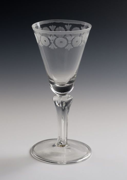 Kelkglas, fopglas, gegraveerd met rozetten en strale...
