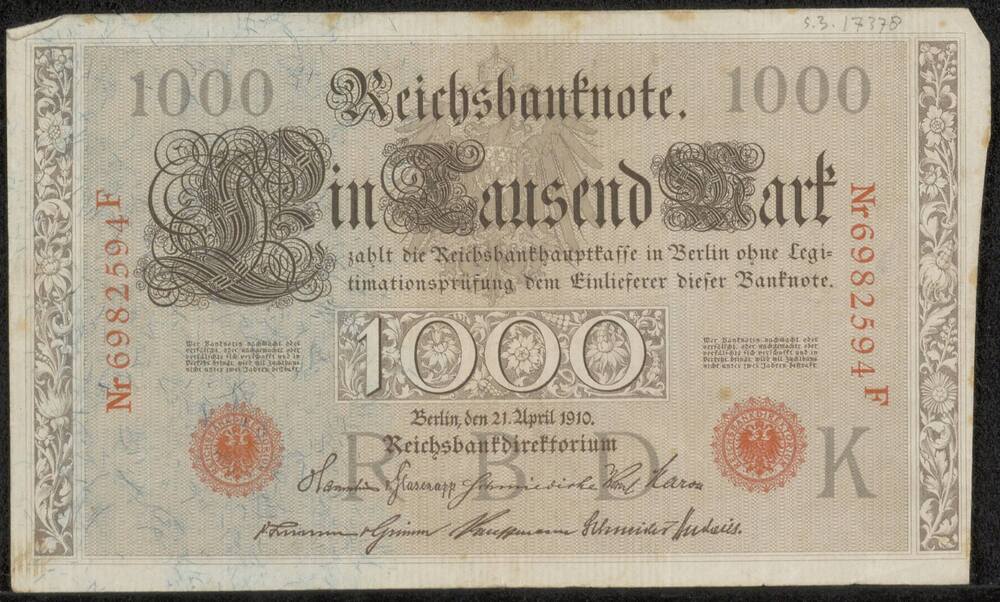Bankbiljet, Duits, 1000 Mark, 1910, Nr. 6982594F