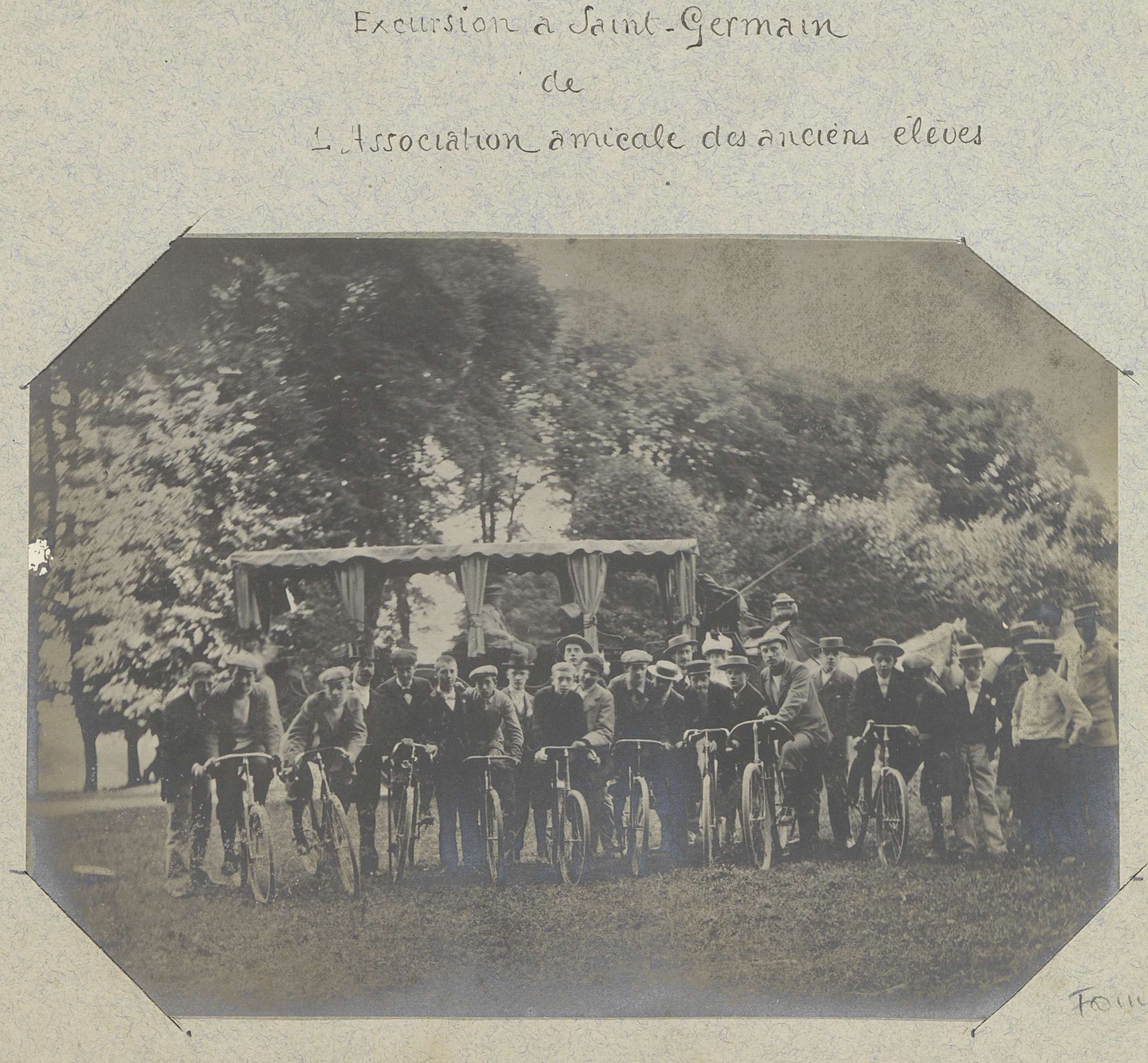 Groepsportret van oud-leerlingen op fietsen ('l'Asso...