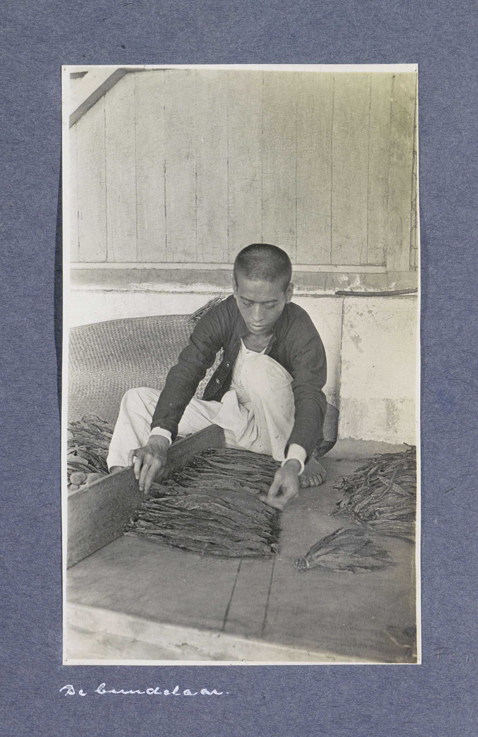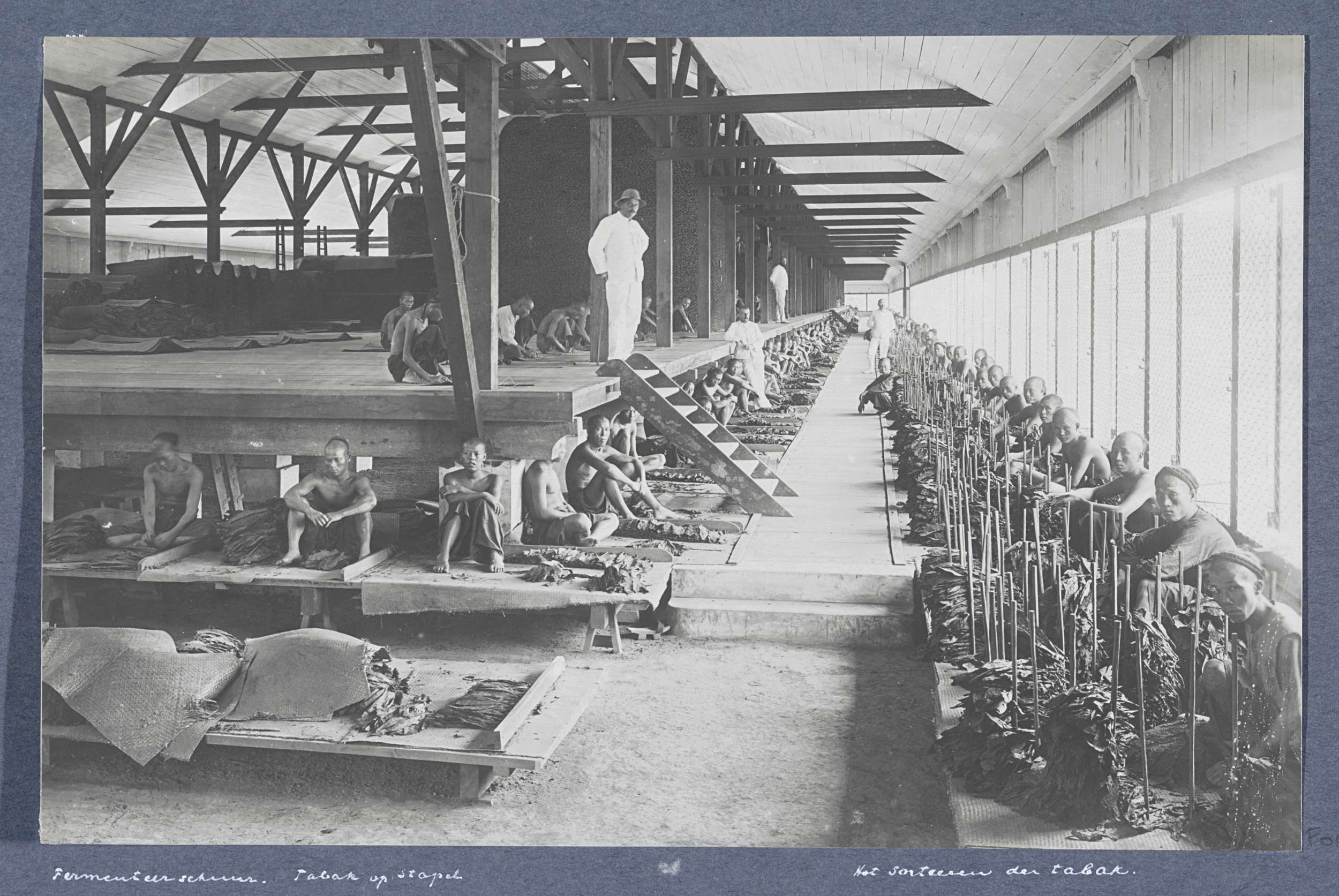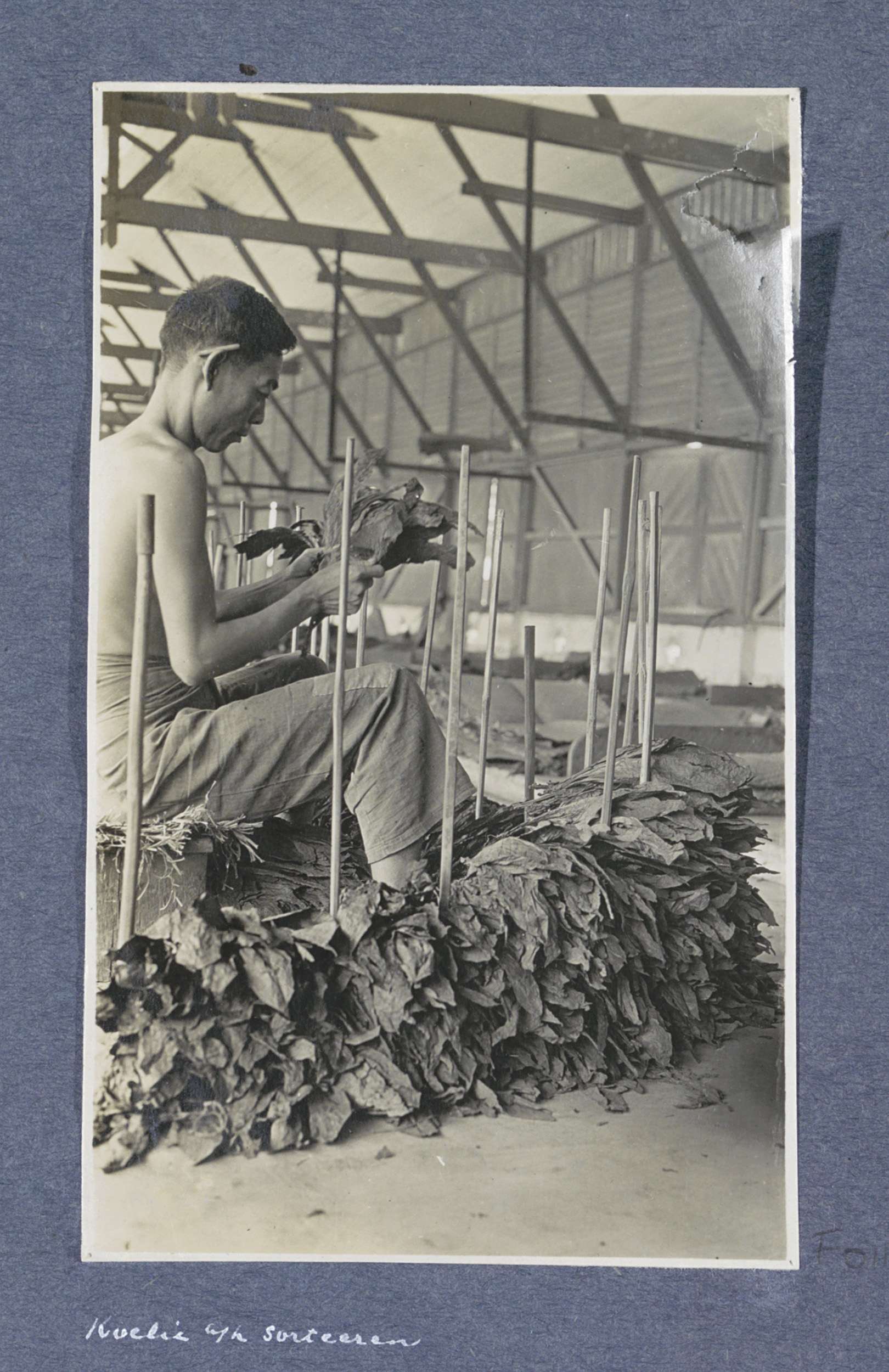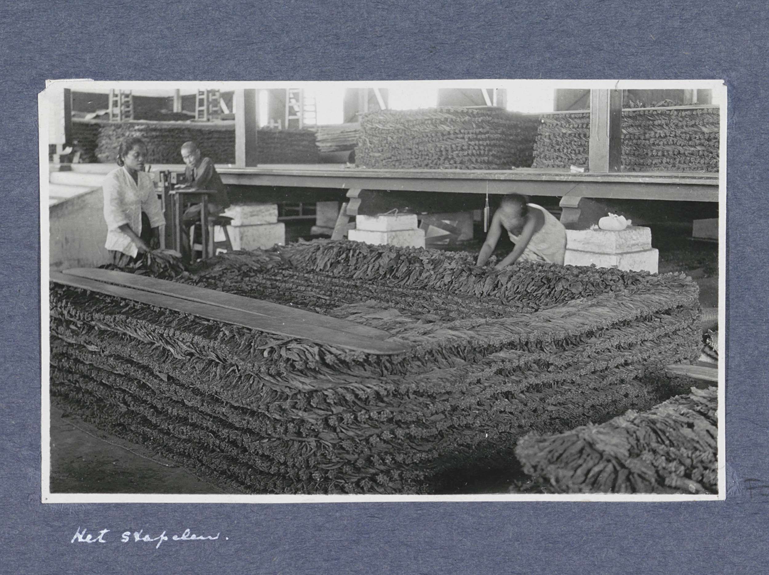 Man bundelt tabaksbladeren in een schuur op Sumatra