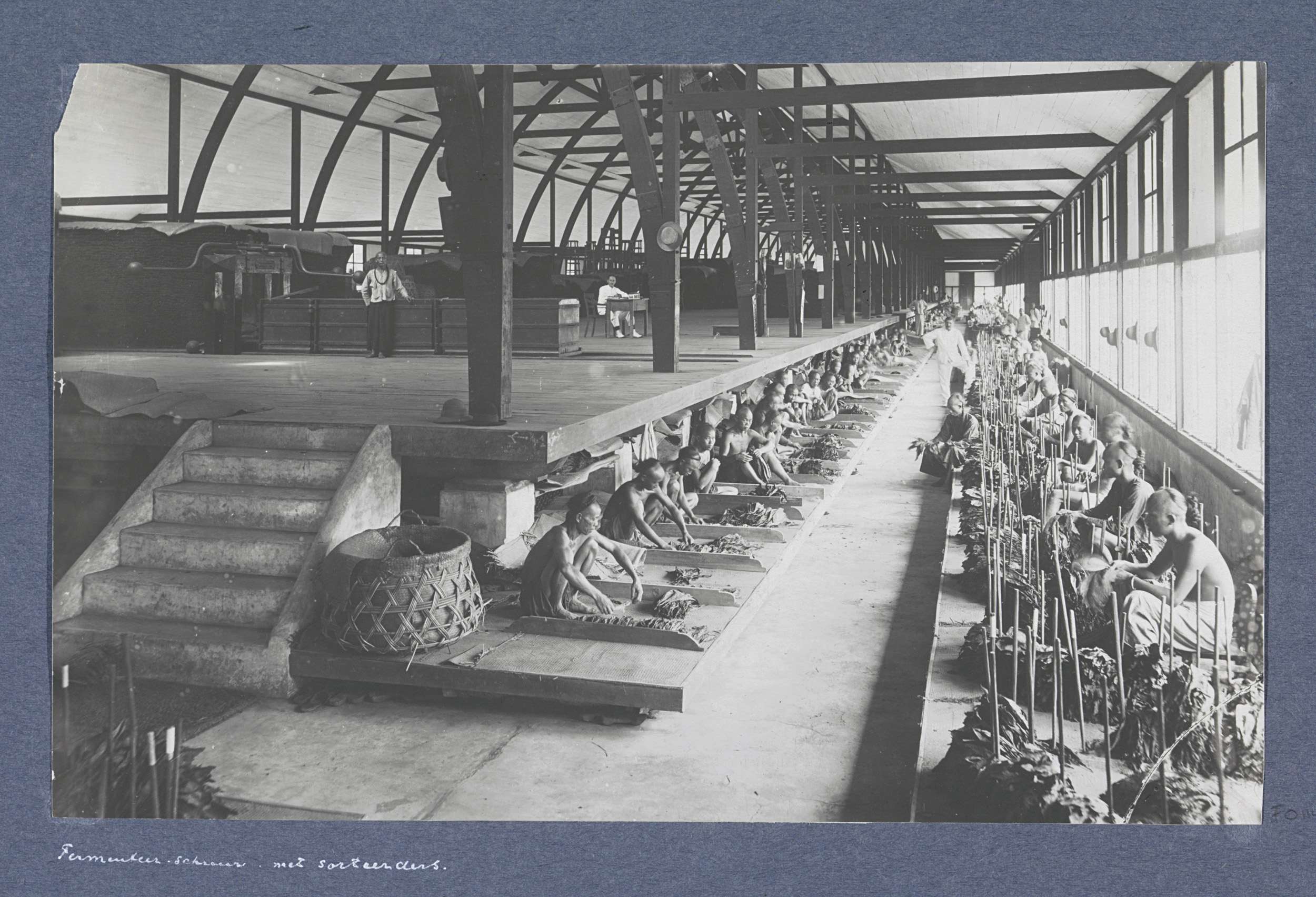 Contractarbeider sorteert tabak in schuur op Sumatra