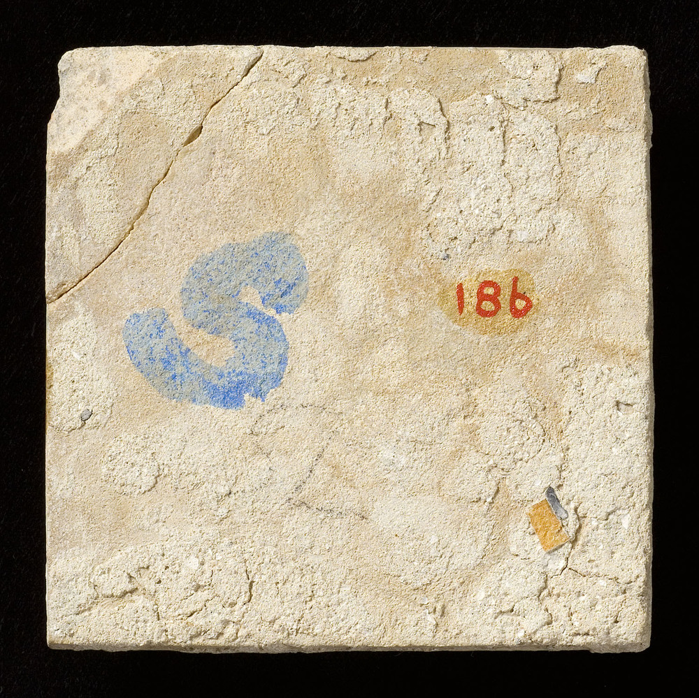 Tegel van keramiek met tinglazuur, voorstellende: De...