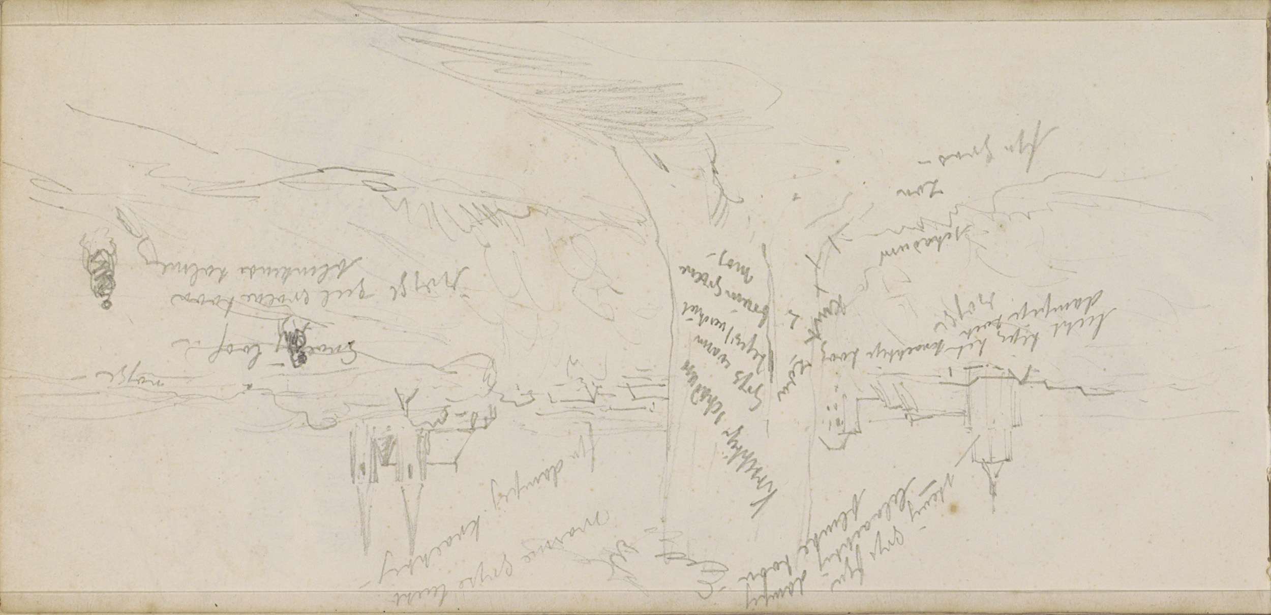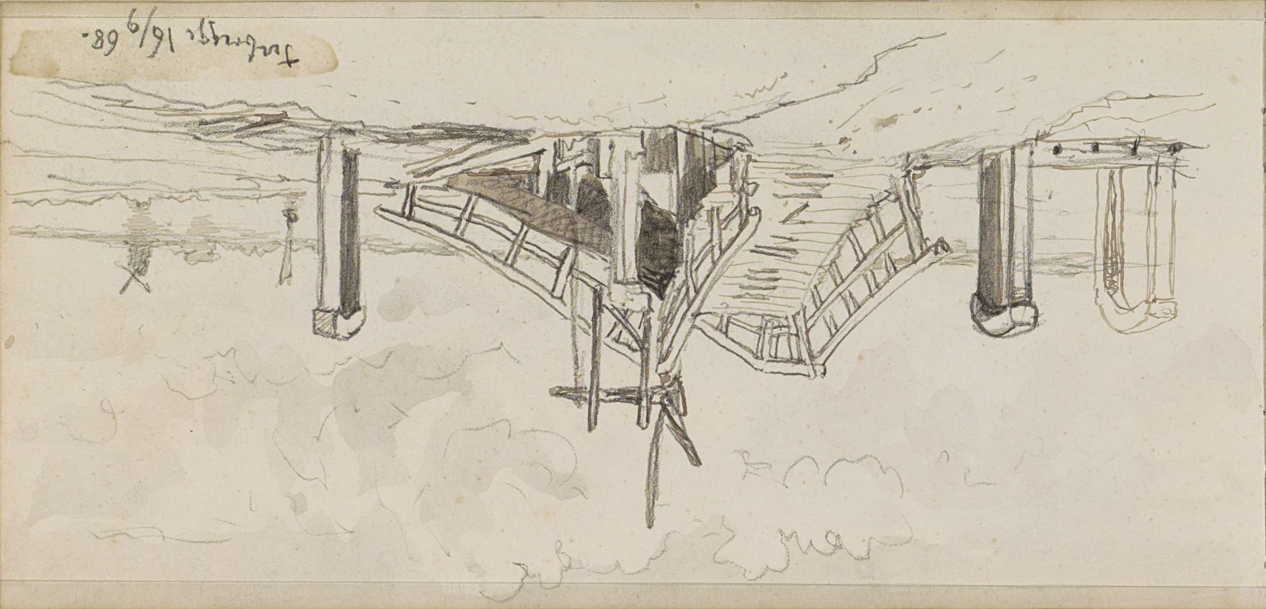 Rivierlandschap met een brug en een figuur in een ro...