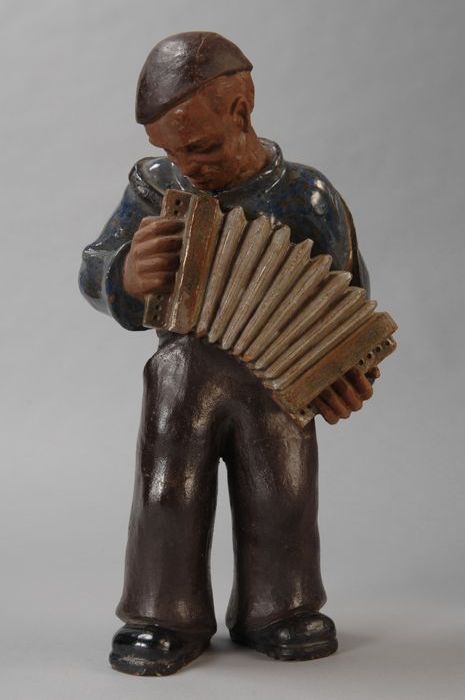 Terracotta beeld van accordeonist, etalagemateriaal ...