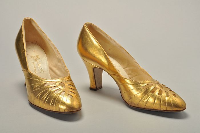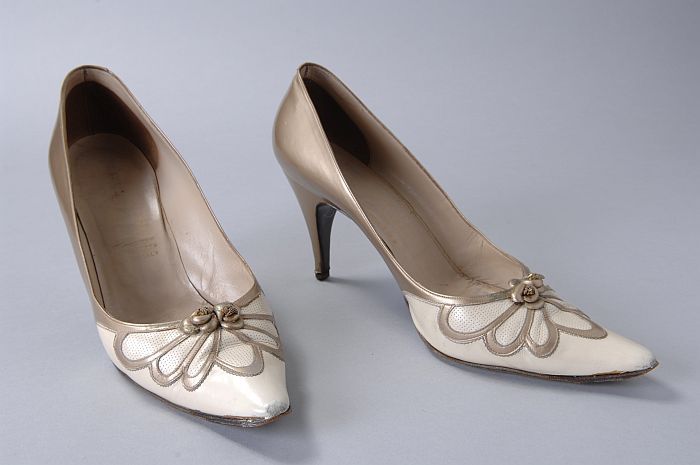 Pumps van goudkleurig en parelmoerwit leer met bloem...