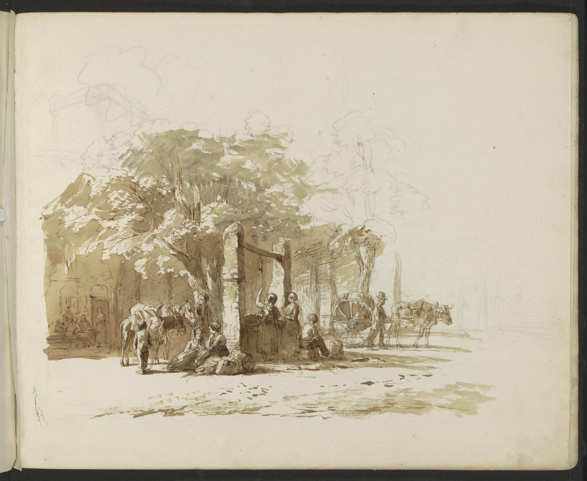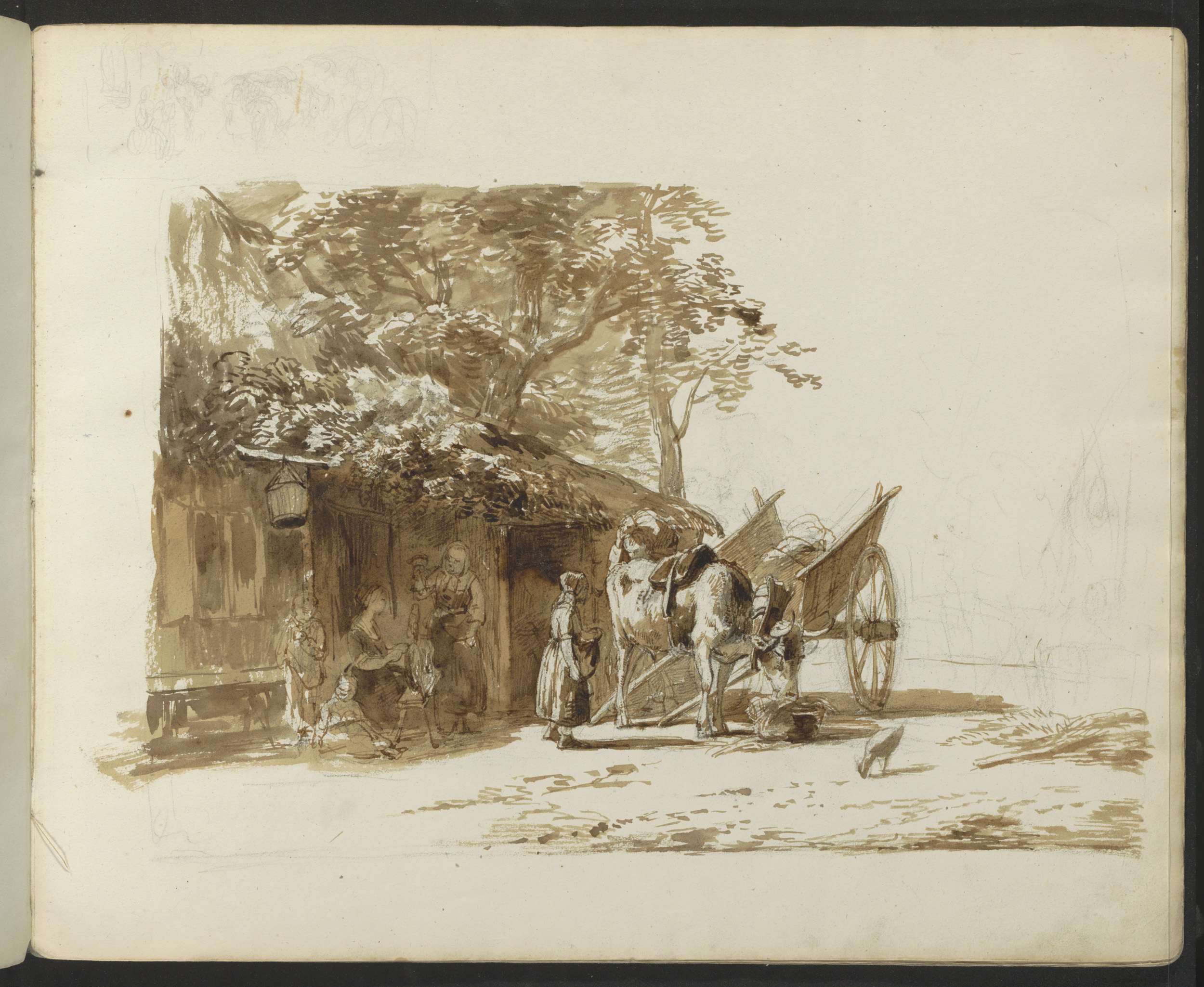 Ossenkar en figuren op een dorpsstraat