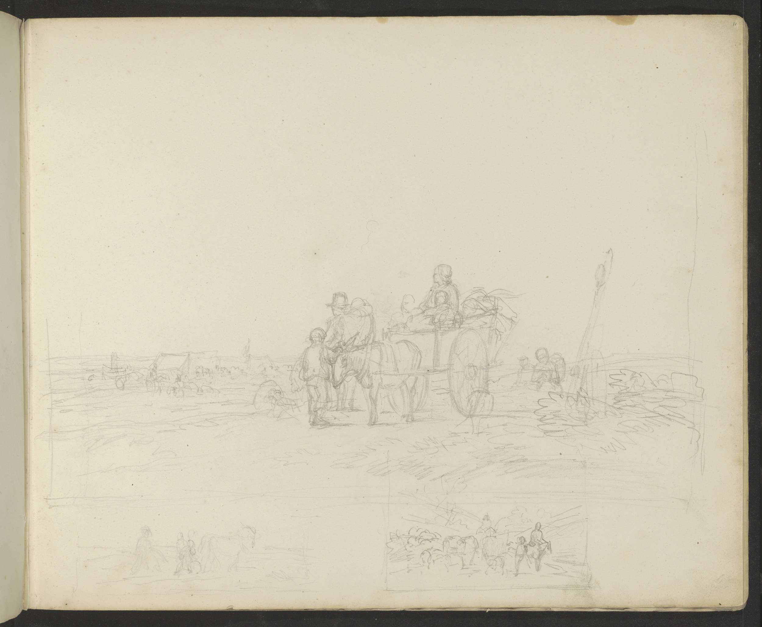 Landschap met figuren op en naast een kar
