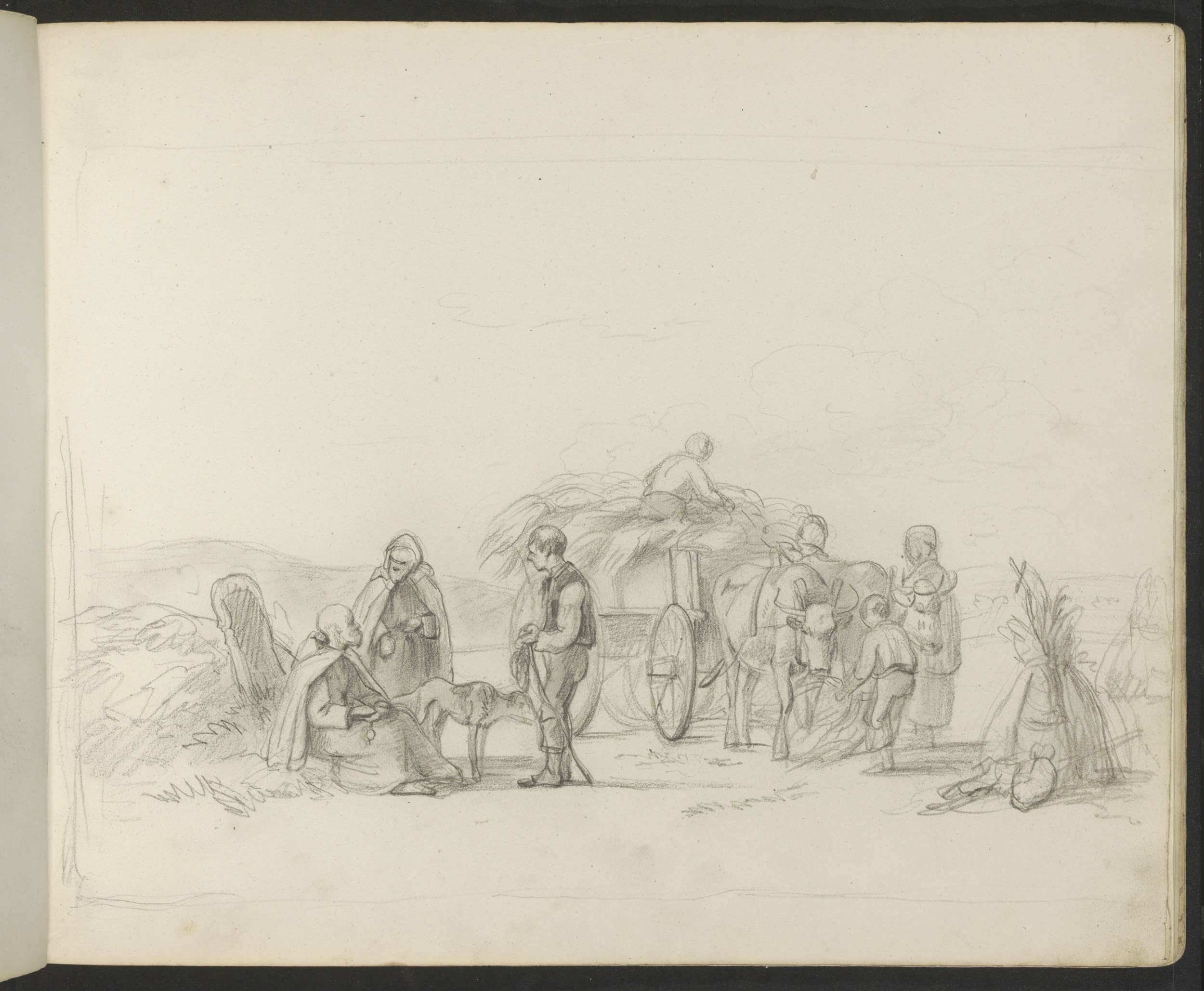 Landschap met korenschoven en figuren bij een hooiwagen