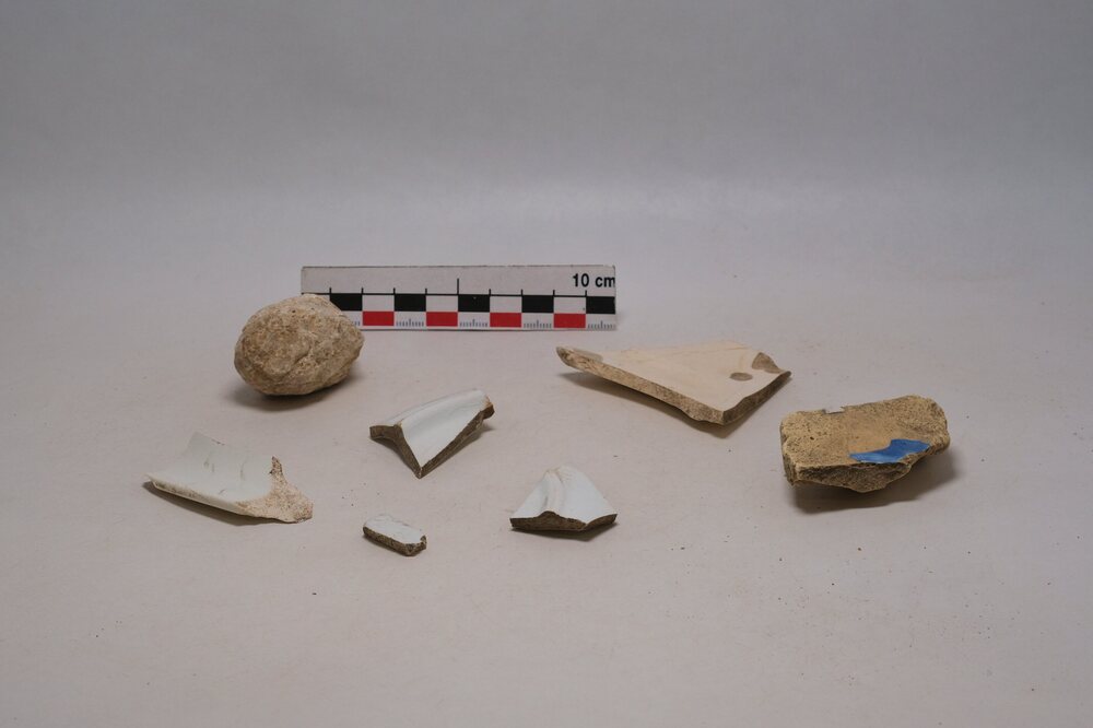 Fragmenten, ijzer/schelp/leer/been/hout/aardewerk,