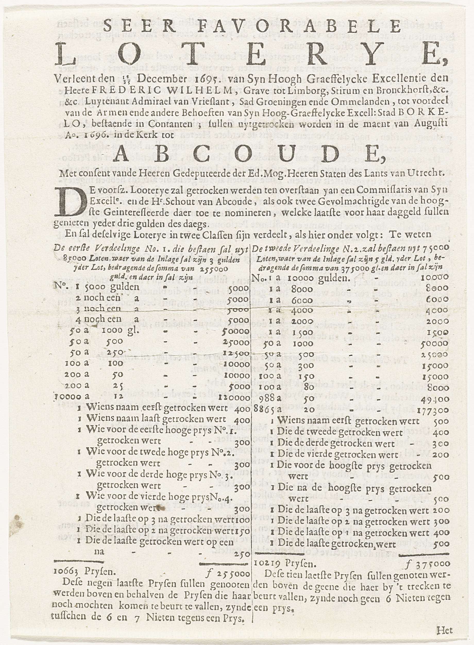 Aankondiging van een loterij te Abcoude, 1696