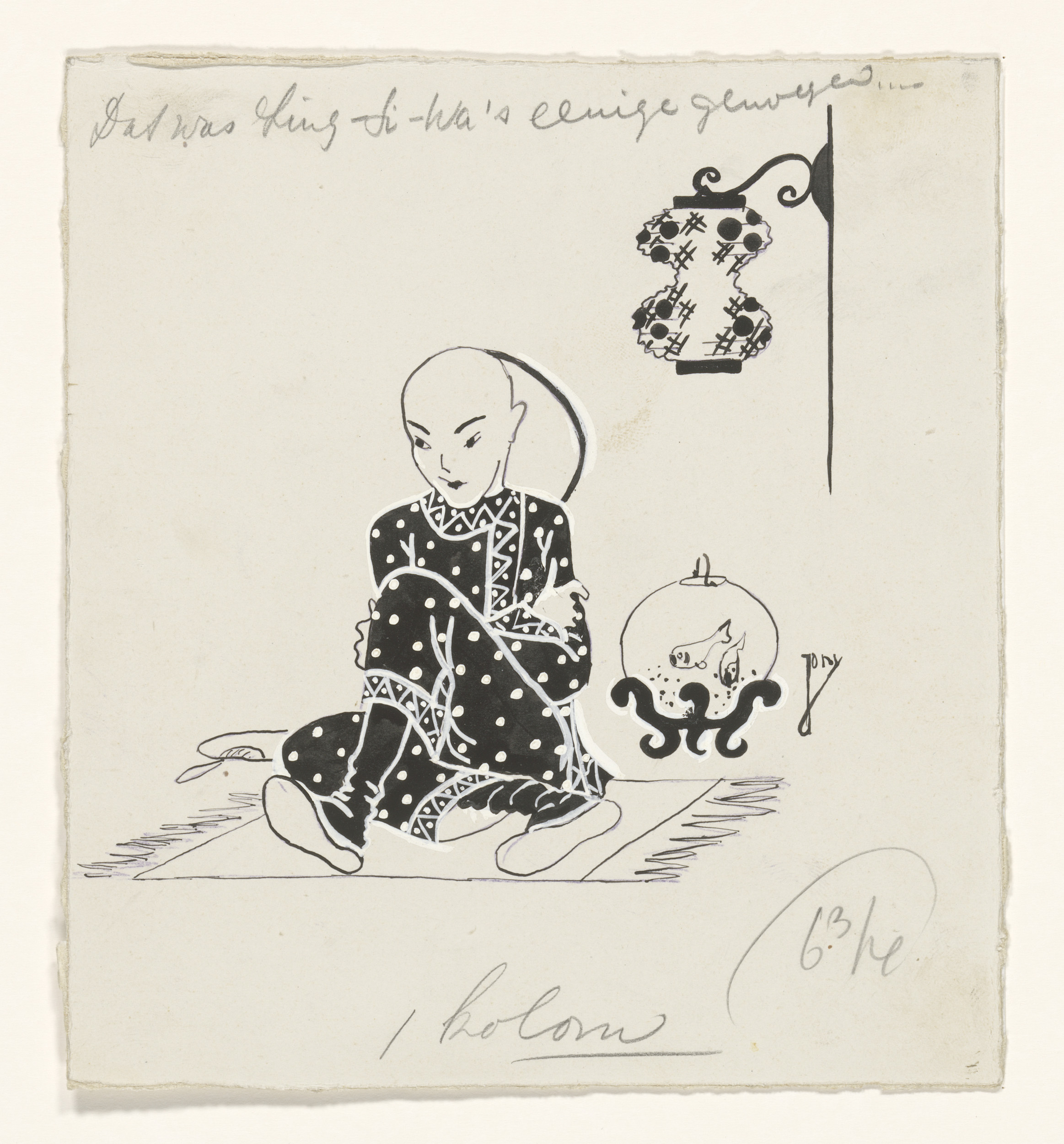 Ling-Ti-Wa zittend naast een vissenkom