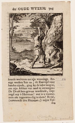 Een man met een stok bestrijdt een draak die uit zij...
