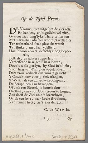 Blad met titelprent, titelpagina en 22 kolommen teks...