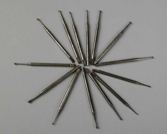 Veertien metalen tandartsboortjes (alleen de boorkop...