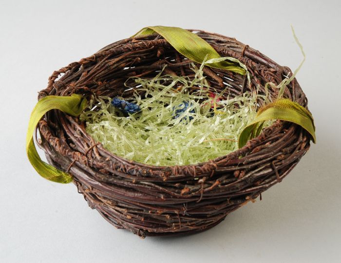 Vogelnest van twijgen en ijzerdraad, met zijden lint...