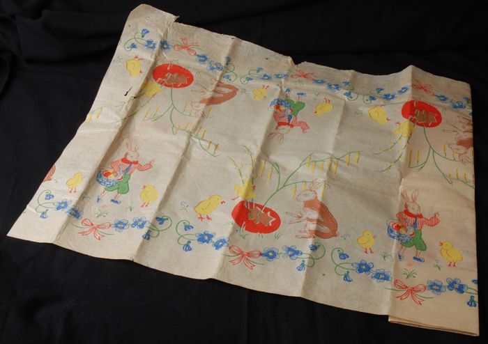 Tafelkleed bedrukt met bloemen, kuikens en hazen, Pa...