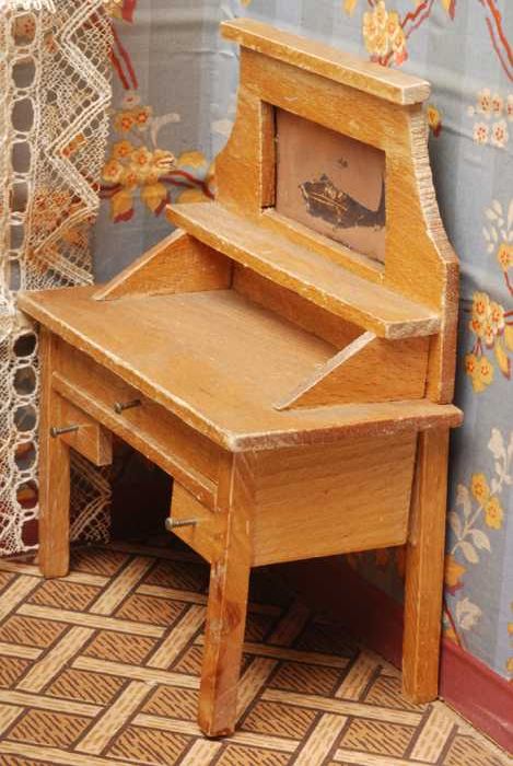 Beukenhouten miniatuur kaptafel, blad met daaronder ...