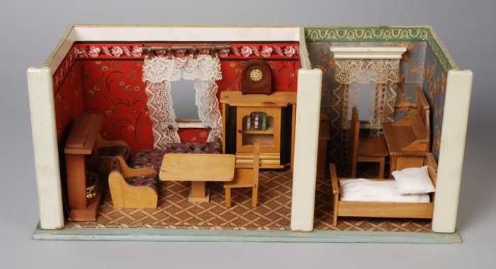 Poppenhuis van twee kamers, dubbele poppenkamer: lin...