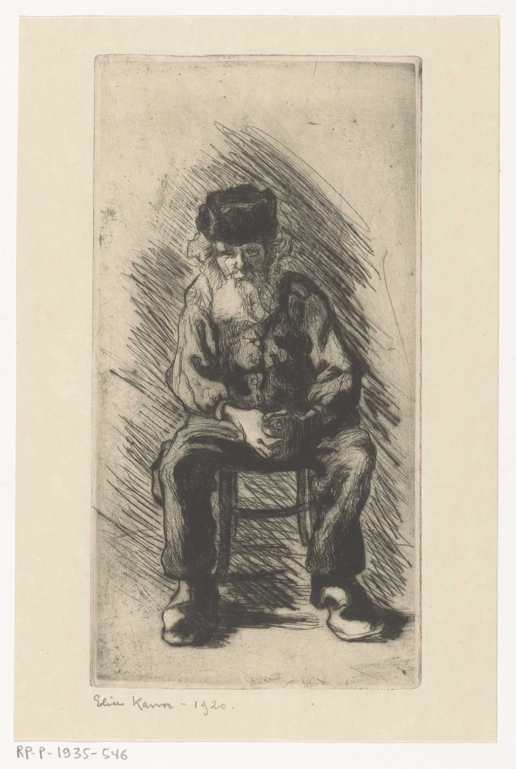 Zittende, bebaarde man met hoed