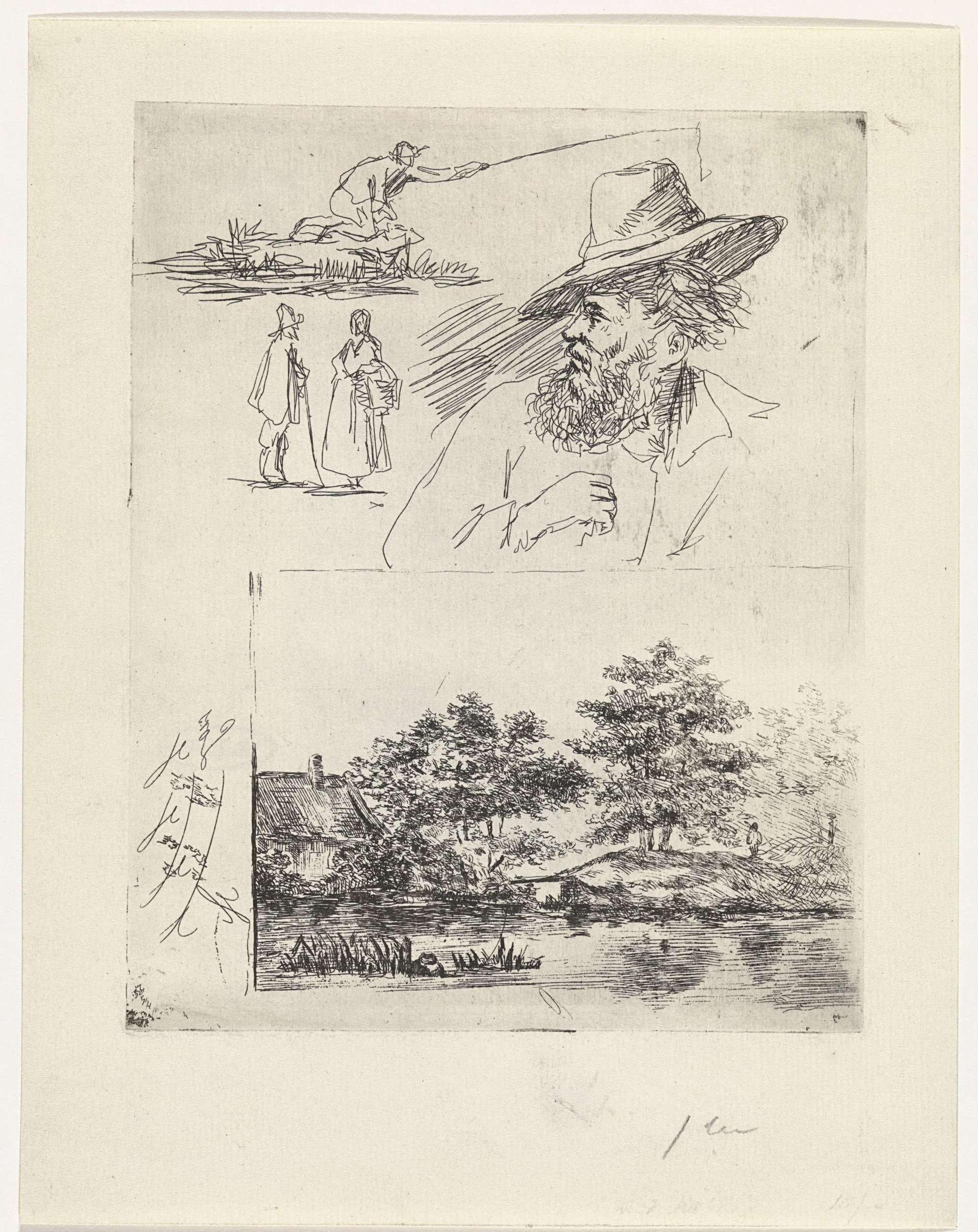 Studieblad met vier figuren en een landschap