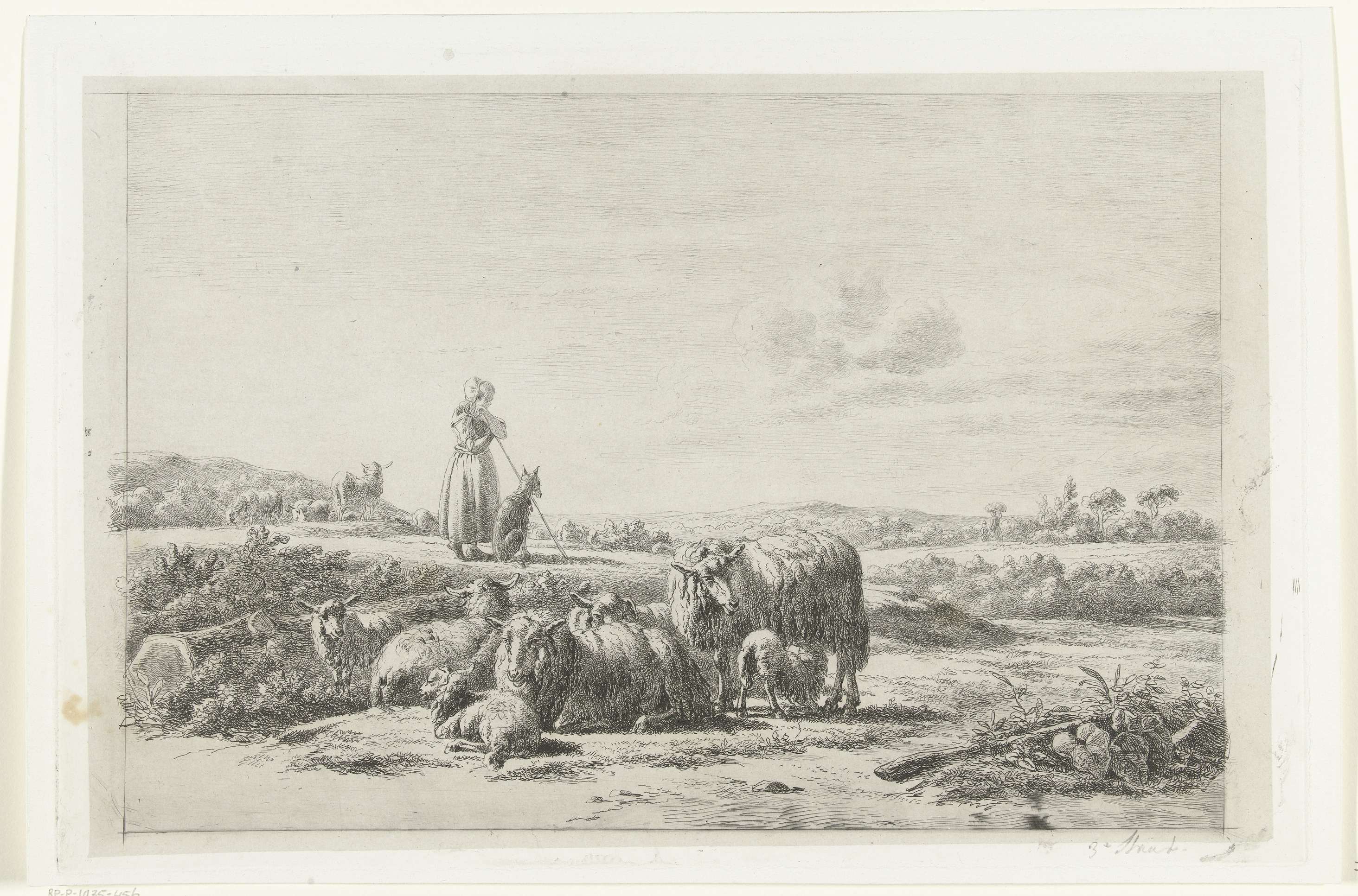 Landschap met herderin en hond bij kudde schapen