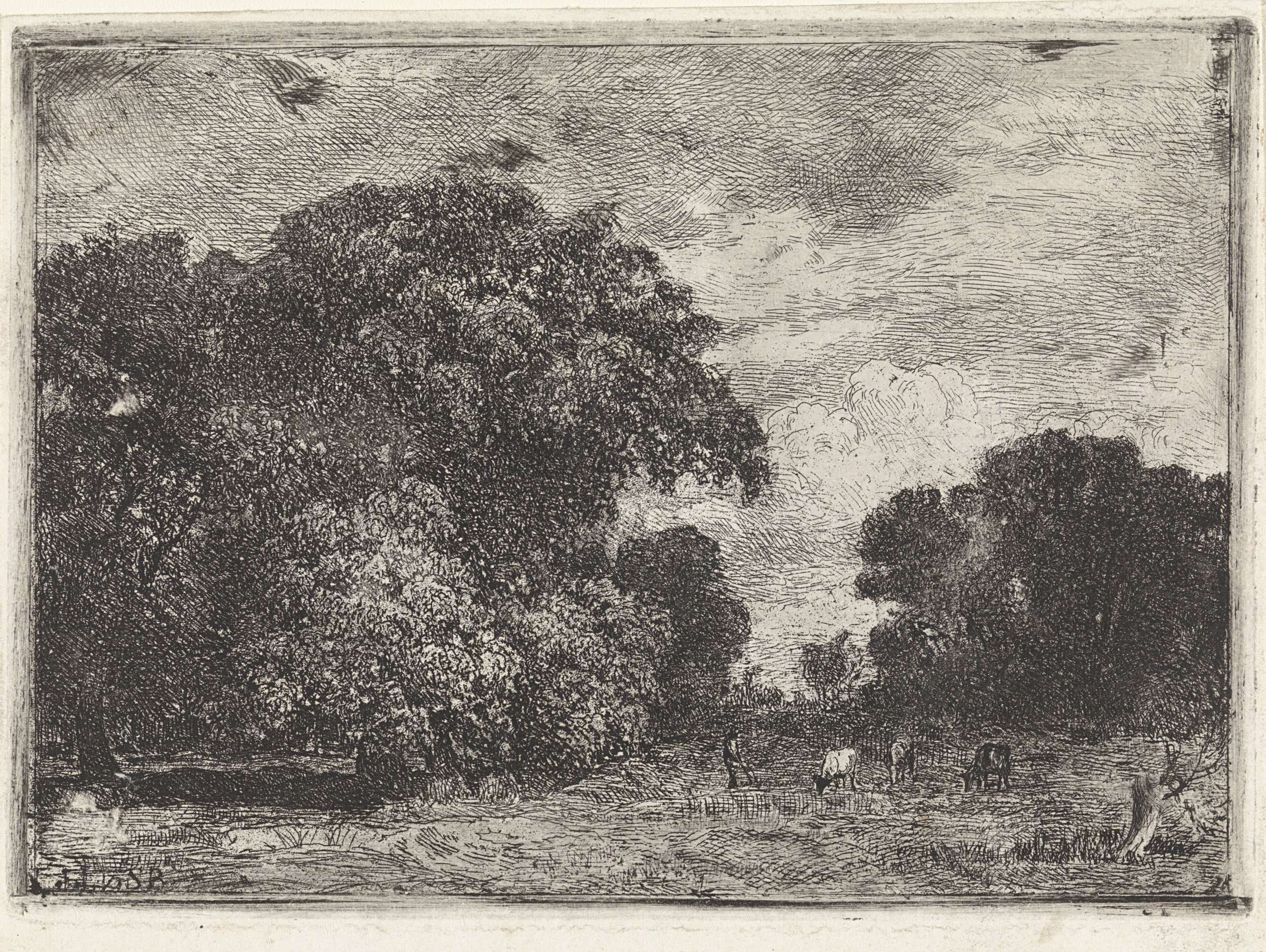 Landschap met bomen en drie grazende koeien