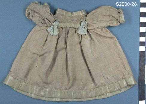 Jurk van beige zijde, kort model met pofmouwen met m...