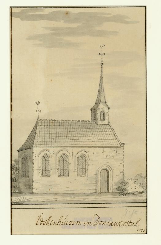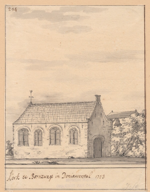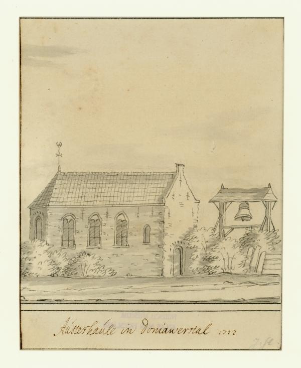 Gezicht op de kerk zonder toren maar met klokstellin...