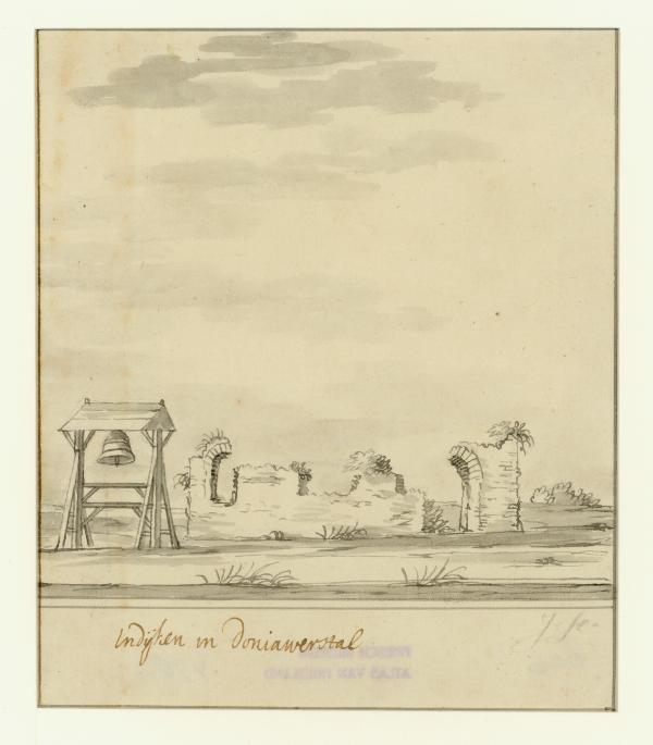 Gezicht op de bouwval van de kerk te Indijk in Donia...