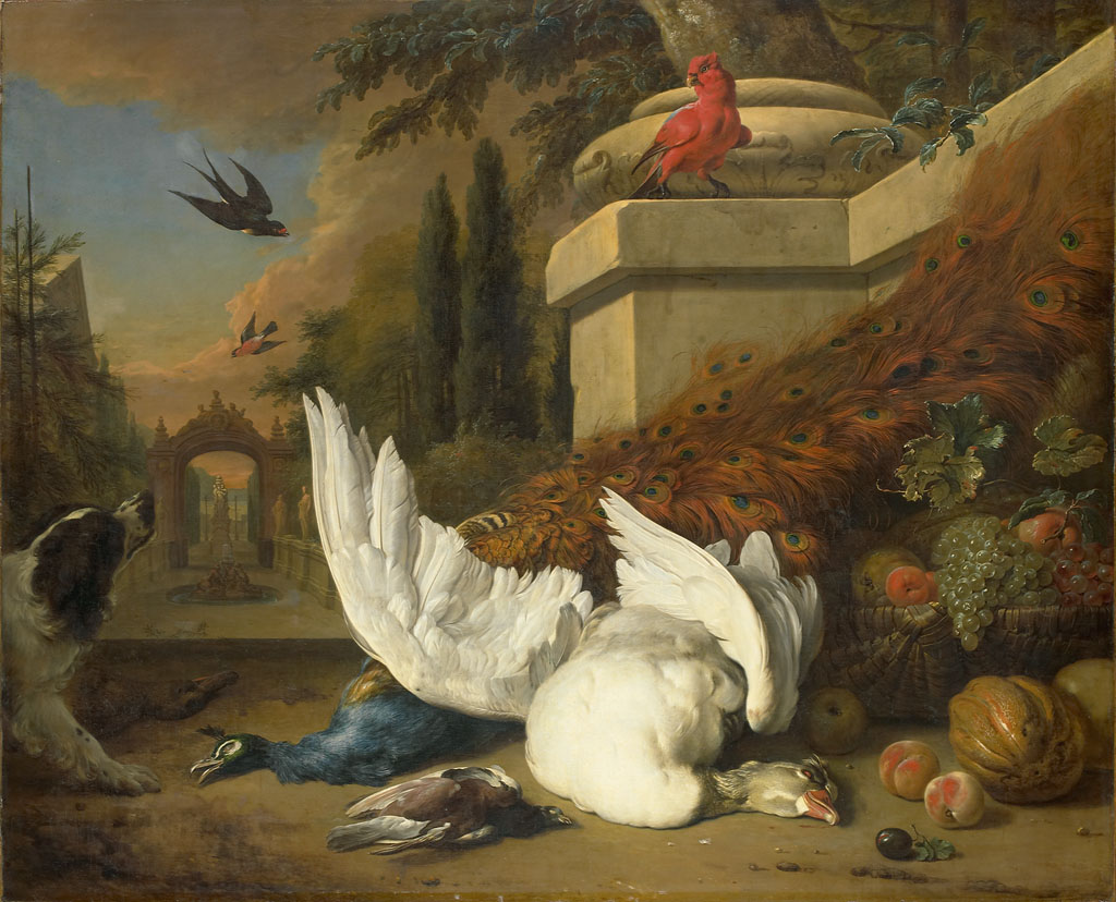 Een hond bij een dode gans en een pauw