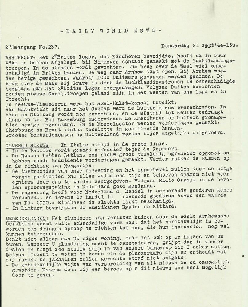 Daily World News, donderdag 21 september 1944